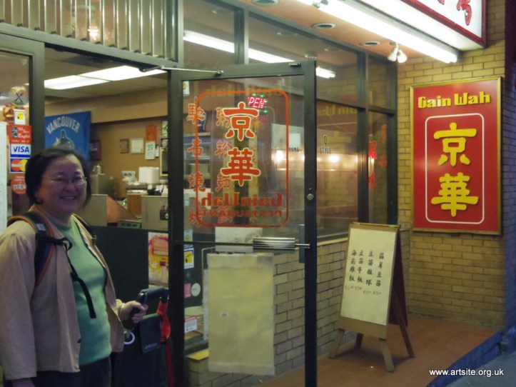 Here’s a shot of one of my favourite restaurants in Vancouver, the Gain Wah. It’s on Keefer Street in the part of Chinatown that still looks and feels the same as ever. The food here is delicious and homey, the atmosphere is a traditional Chinatown diner: friendly, unpretentious and comforting in its lack of trendiness. (and that there is my friend, the artist Vanessa Lowe, who accompanied me on my last visit).