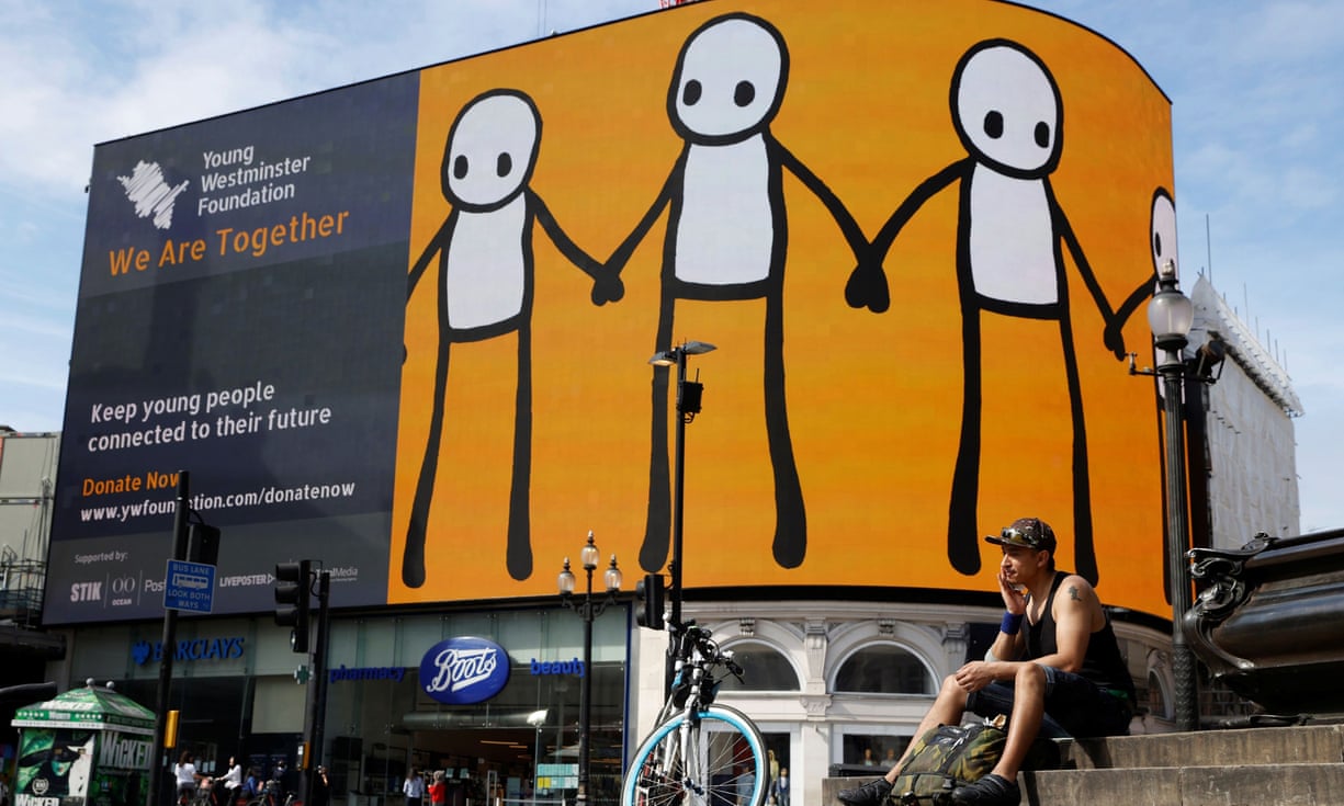 During the spring lockdown Stik was involved in a project to reach out to young Londoners. After an ONS study showed young people were twice as likely as 55- to 69-year-olds to have experienced loneliness during the lockdown, Stik has been creating a series of artworks for a campaign to help them. Now 3D versions of the characters holding hands are being installed around London.