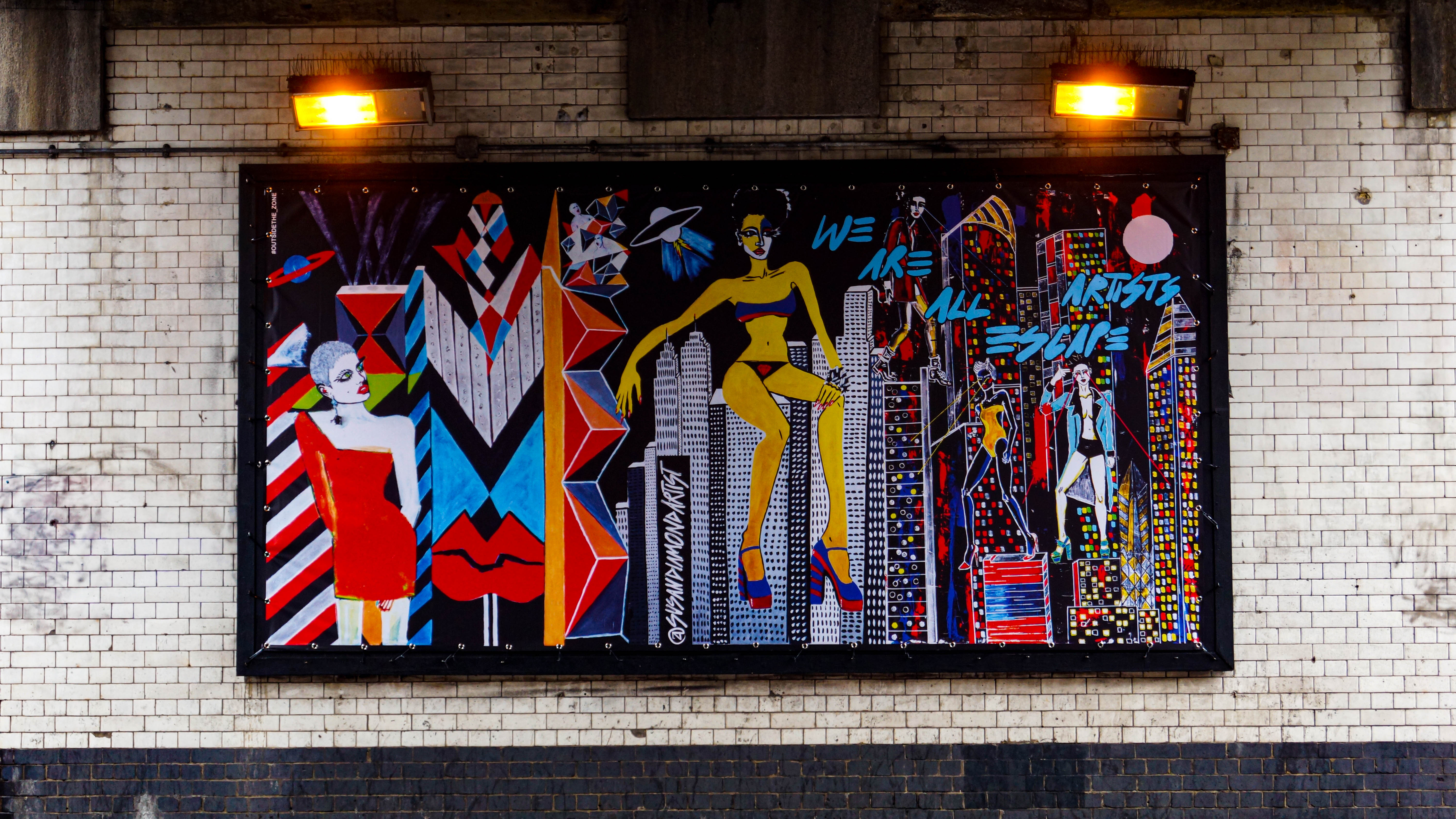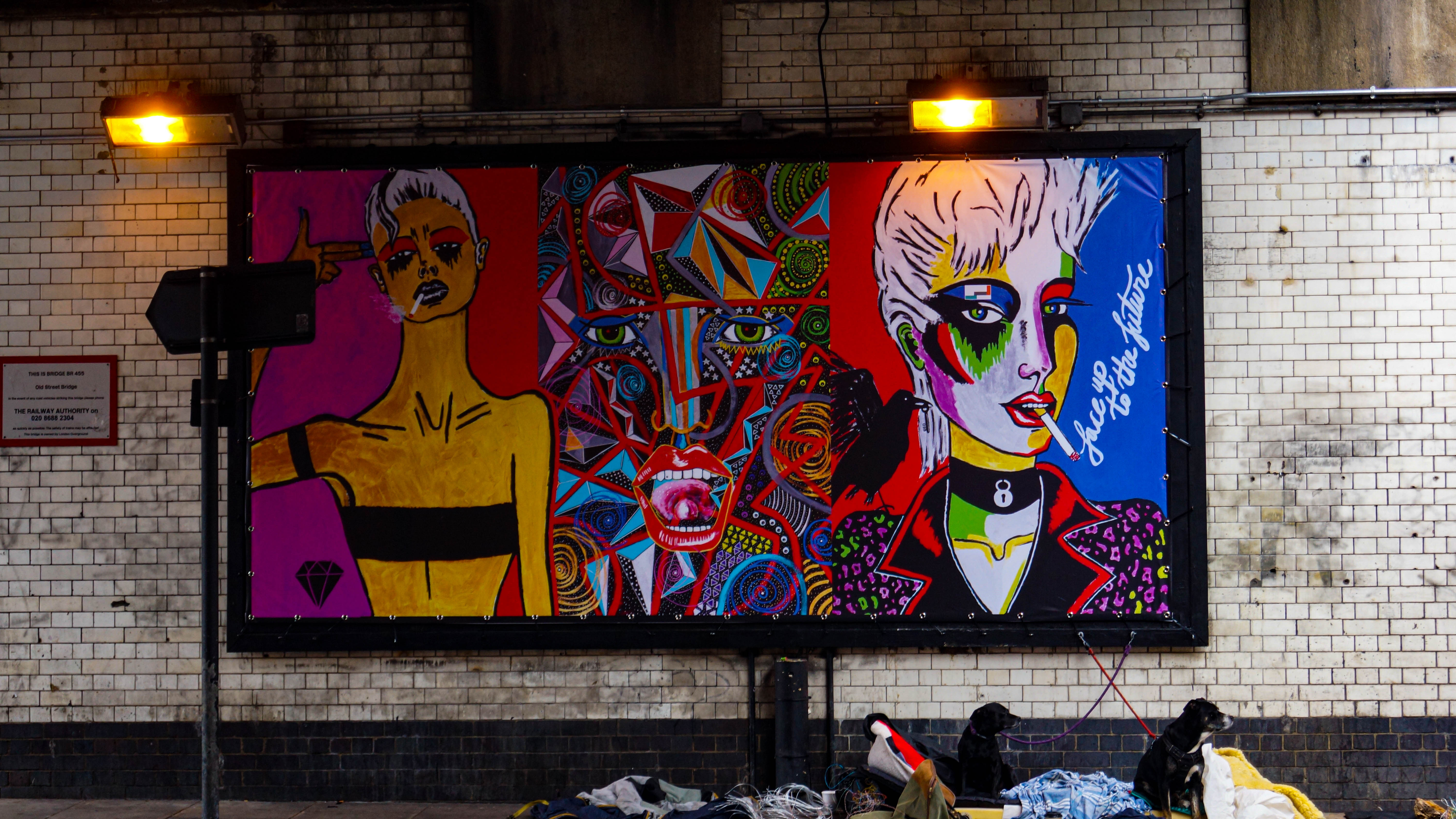 Sadly, subversive underground art doesn’t get exhibited very often, even in a place like London. But one of the most fantastic things was, this summer in Shoreditch under the railway bridge at Old Street where it meets Kingsland Rd Susan was able to instal huge billboards with prints of her paintings. It was absolutely amazing; the incredible colour and the subversive direct punky aesthetics of the pictures just jumped right out into the street. It was exactly what the neighbourhood needed, especially in this time of coronavirus when the last thing I wanted to see was anything depressing. At the same time, the work is sharp and incisive and a little bit scary – which is also good.