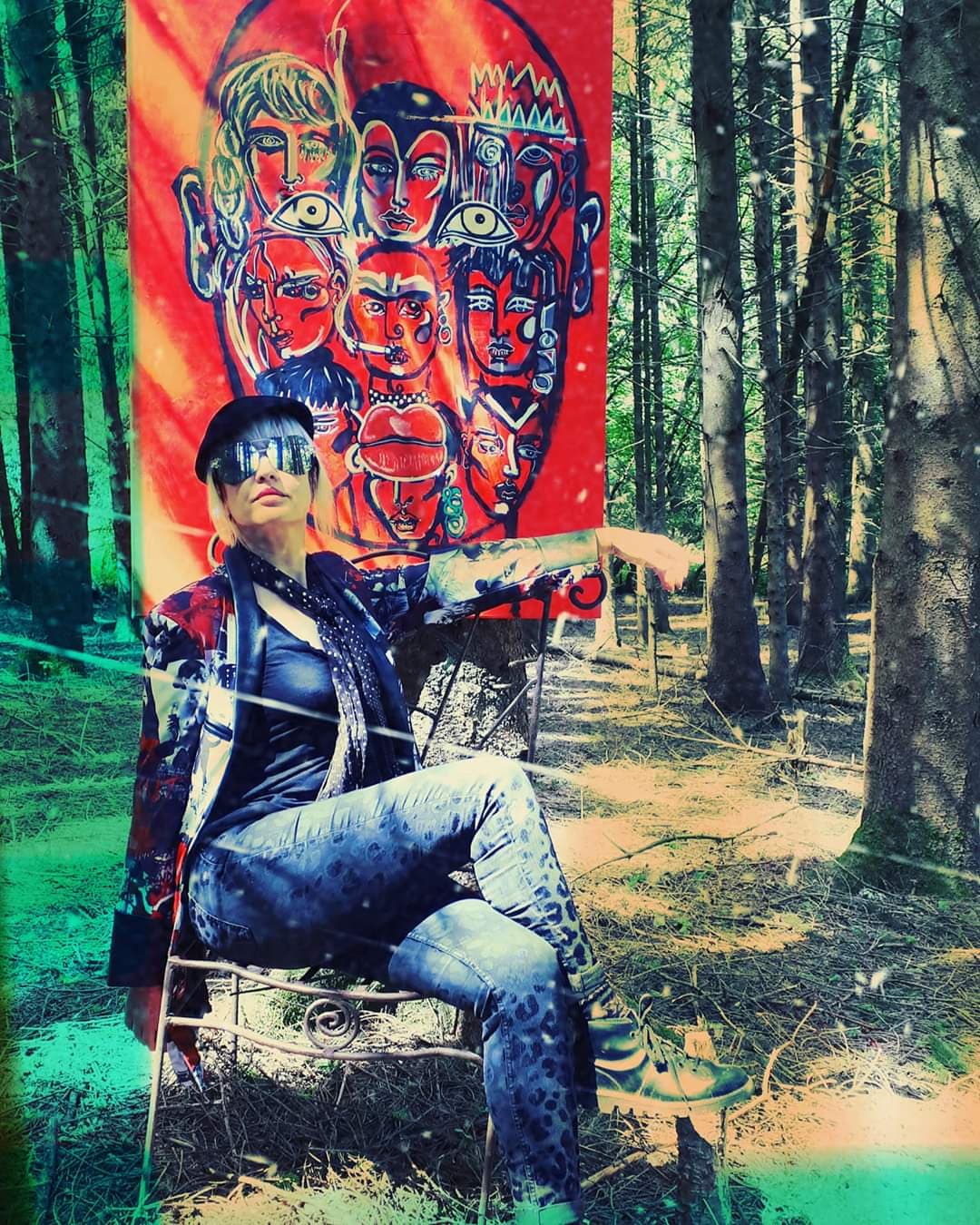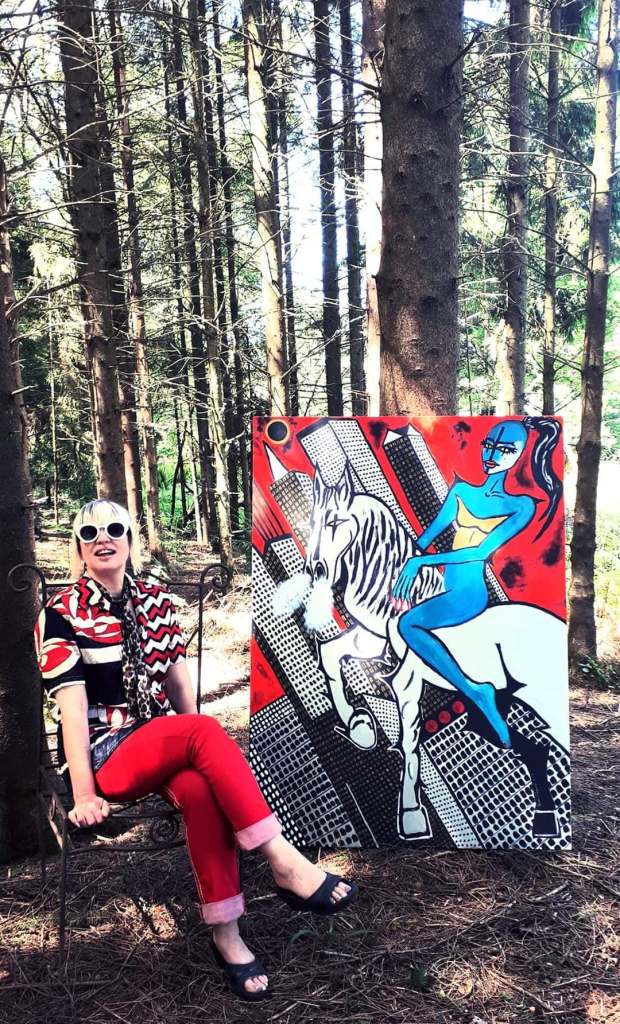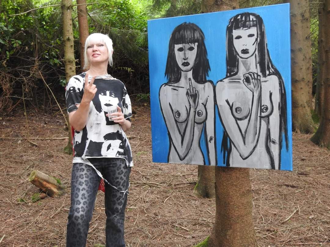 Anyway I’ve been familiar with Susan’s work for a long time but I didn’t realise at first that she is a painter. She has a very distinctive style based on punk iconography but transposed to something entirely her own. The principal icon is a powerful, even deadly but ultimately reassuring female goddess-like figure, which has an element of Susan’s self portrait in her – yet we can all recognise ourselves in her persona.