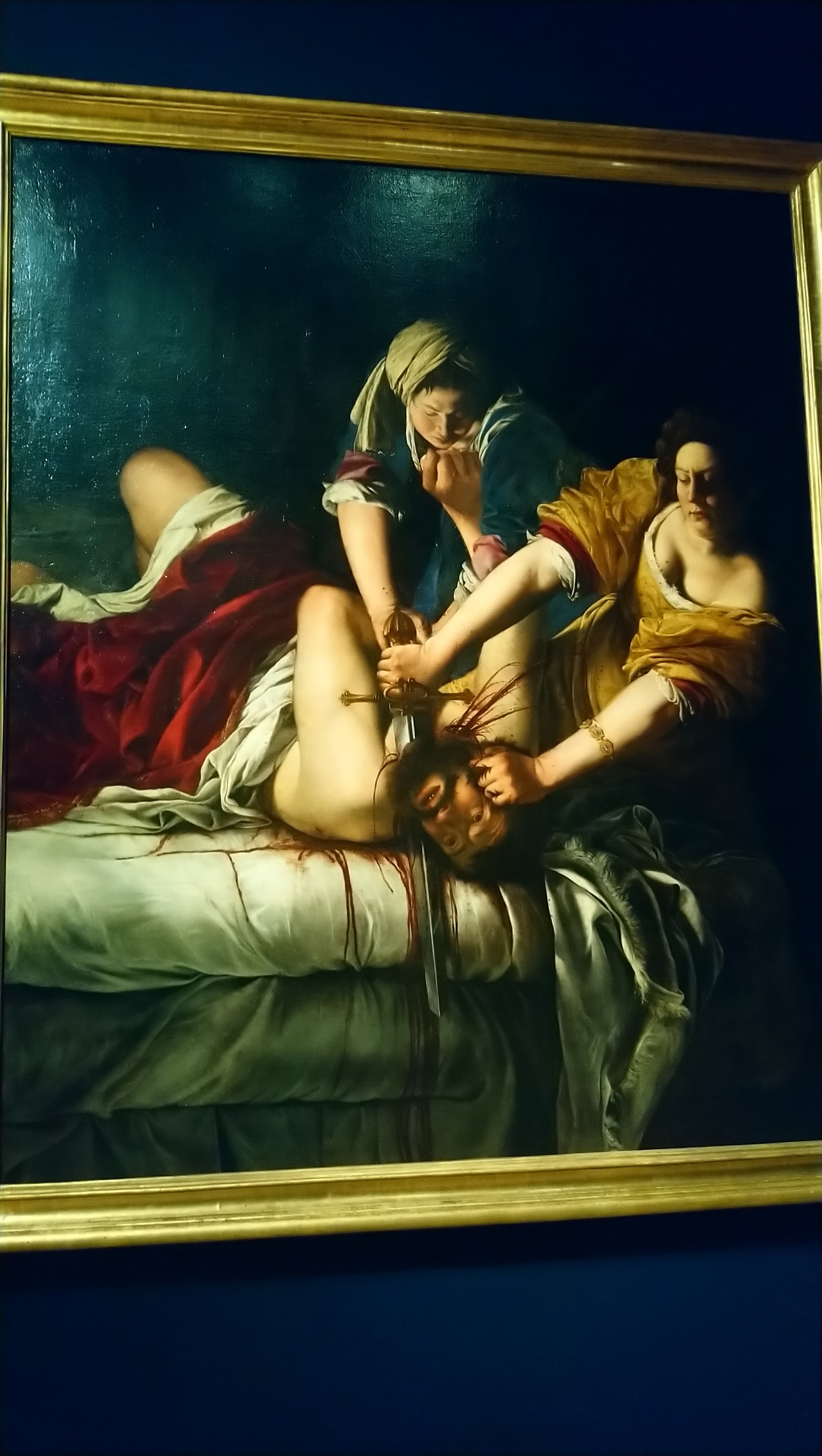The key story often told about Artemisia is that she was raped by her father’s friend, the painter Agostino Tassi. Tassi was convicted for raping Artemisia and for breaking his promise to marry her after the rape was disclosed. It is a terrible story, but the big question is whether we should consider it when we look at the paintings. Can we assume that her paintings are powerful and depictions of females overpowering men because of her treatment at Tassi’s hands? I think that gives too much power to Tassi (who, according to the court documents, was just a pure *******). Every evidence (such as the Susannah, painted a year earlier) demonstrates that Artemisia was already a vigorous strong-minded painter fully capable of taking on the powerful subject matter.