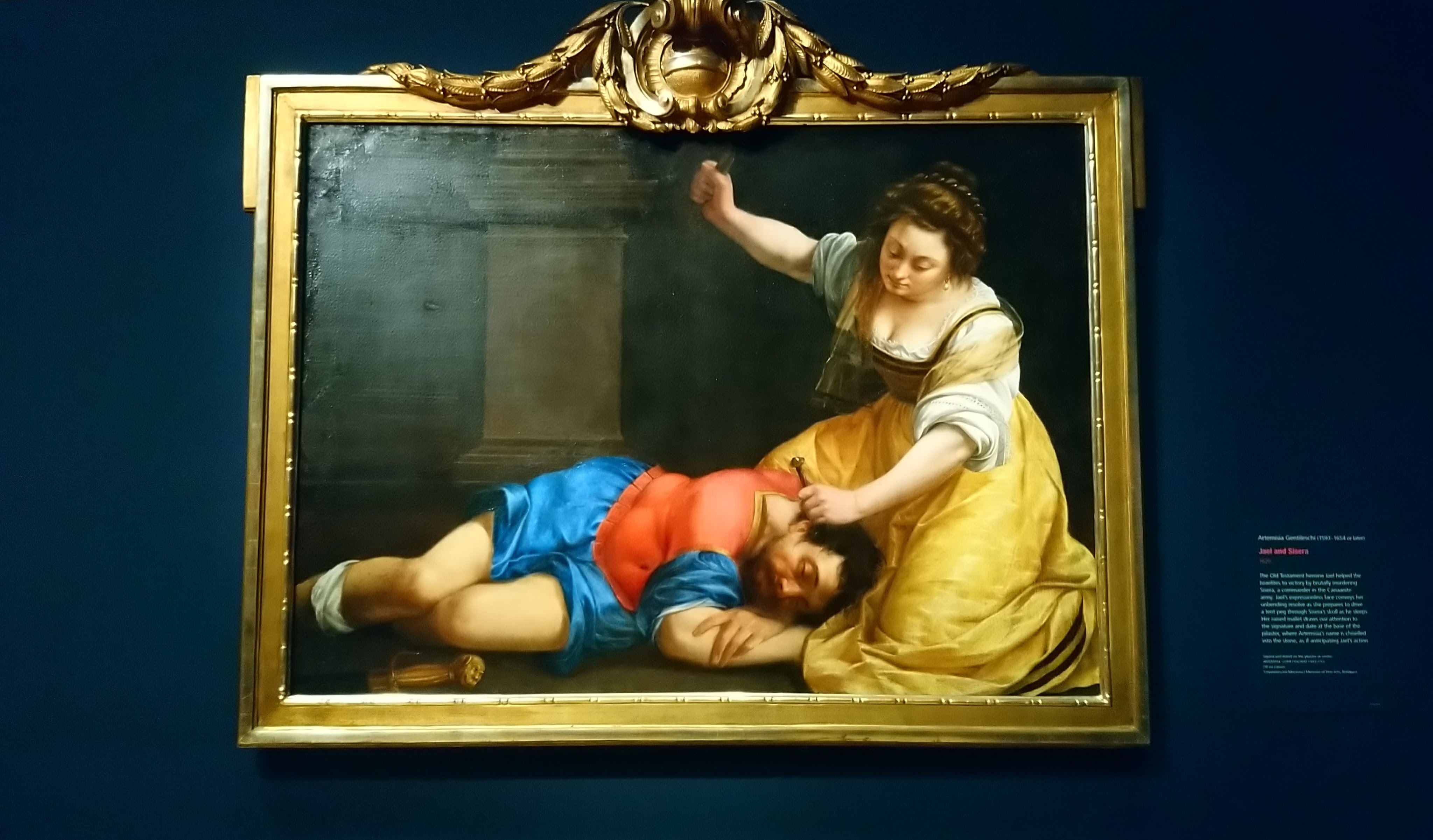 Another picture (top) depicts the killing of defeated general Sisera by Jael, another Hebrew heroine from the Bible. In this case the weapon is a tent peg and we see her raising her arm, about to bring it down upon the man’s head. It’s a less bloody image than the gore-spattered Judith, with some hints of titillating chastisement.