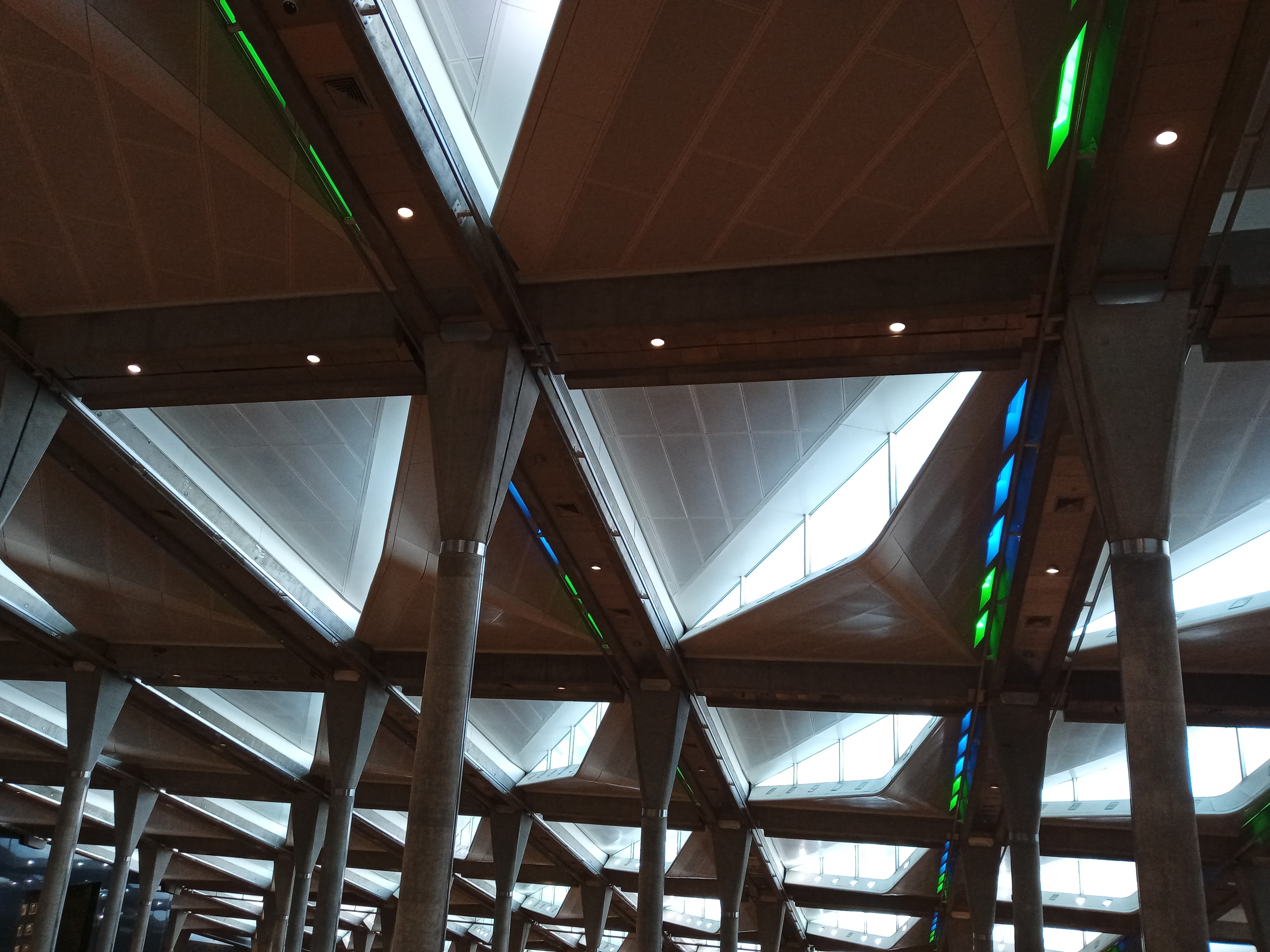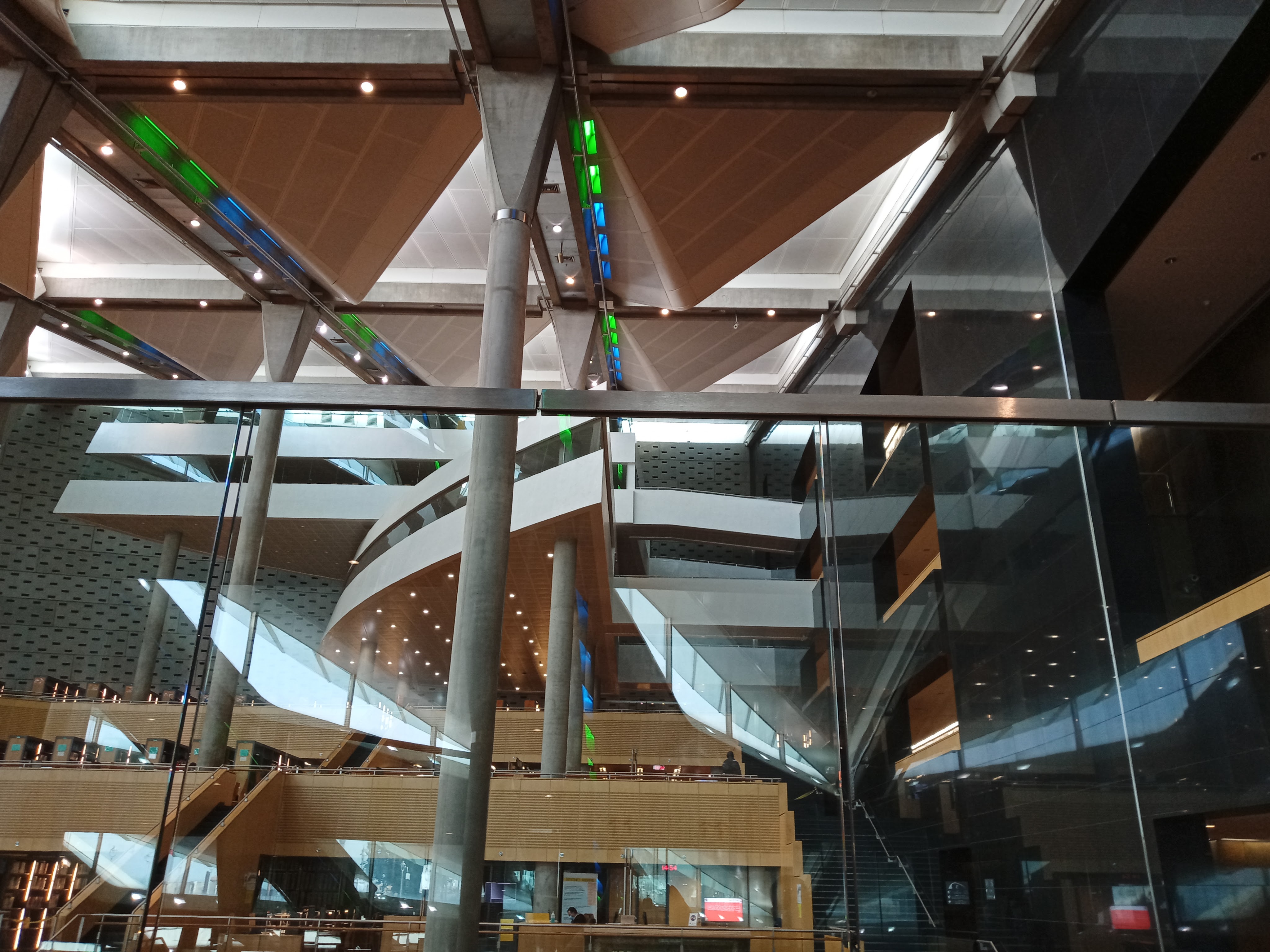 Designed by Austrian architect Christoph Kapeller and Egyptian architect Ihab El Habbak, it is an unusual and wonderfully functional design that combines beauty and grace with comfort. The main reading room is underneath a 32-meter-high glass roof that tilts out toward the sea, reflecting the sea and sky, measuring some 160 m in diameter. The interior walls are made of granite from the deep south of Egypt, at Aswan.