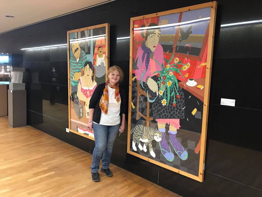 These are two paintings by the Alexandrian painter Nazir Tanbouli. He made them in London, remembering several iconic characters he knew growing up in the city: Aida the flower seller and a cafe run by an Alexandrian family, Eida and her Brothers.