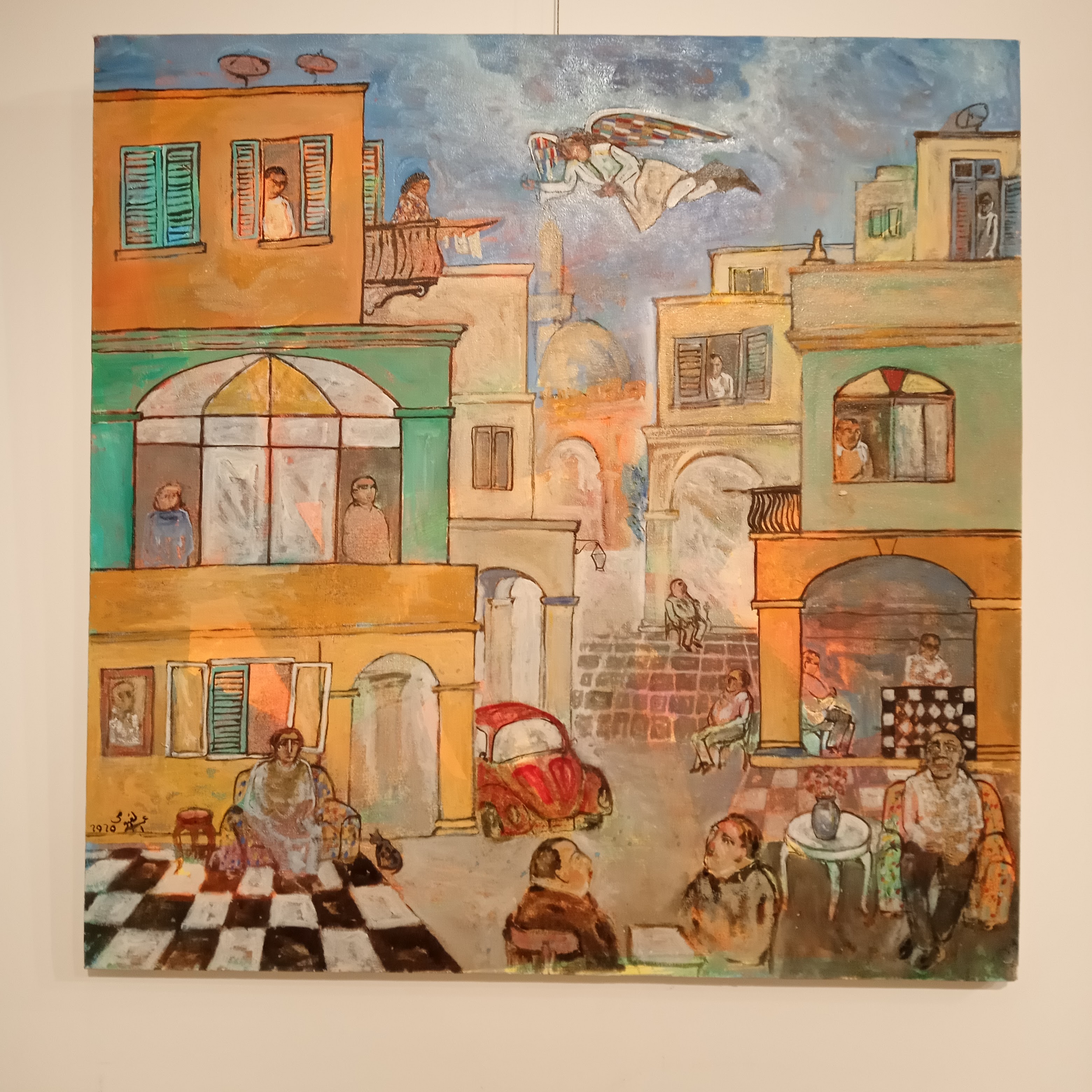 However, the exhibition also presents dynamic and revelatory scenes from Cairo’s older streets. With a sly nod to the colouring of the Impressionists and post-Impressionists, the first artists to depict cities under artificial light, El Fayoumi’s Cairo is both recognisable and timeless. Is he showing us Cairo of the 1900s, the 1920’s, the 1960s or today? The socioeconomic conditions, the way that folks gather in the cafes and the city landscape, the lighting and the animals, are all there as they were in the past. It is an appealing version of the city, observational yet nostalgic and not quite romantic. The pictures offer a sense of how it feels to inhabit the cafes, streets and alleys of Cairo.