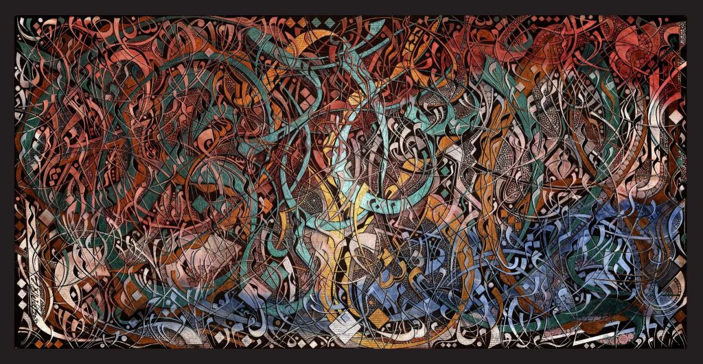 The texts and letters are not meant to be read but are meant to be appreciated as objects in themselves. The fluid beauty of the endless curve, the geometric relationship of lines and spaces, and the hypnotic quality of the relationship of colour to shape, together make up a compelling experience for the viewer.