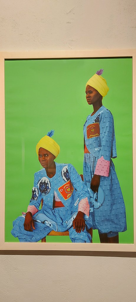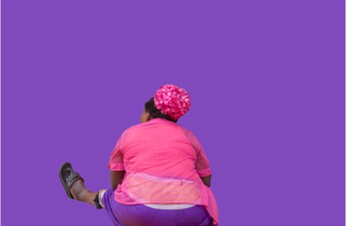 For me the most powerful of the works is one of a large woman seen seated, from behind, wearing a bright pink top and head wrap with a purple skirt. Set against a strongly coloured purple background, she is corpulent but instead of being unattractive, she becomes elemental, like a Venus of Willendorf, a fertility goddess exerting a kind of comforting and comfortable sensual maturity. This picture is exciting and memorable to me; it is less beautiful than the others, and in a sense, it is not really a portrait because you can’t see her face and therefore it is not possible to read anything in her expression. But it’s precisely this which gives the picture its power and causes me to turn back to it. The woman seems to float against this deep purple background and the image suggests something of another world. It makes me think of Sun-Ra and his ArkestRA, and psychedelic Afrofuturism: a really interesting and unexpected direction!*