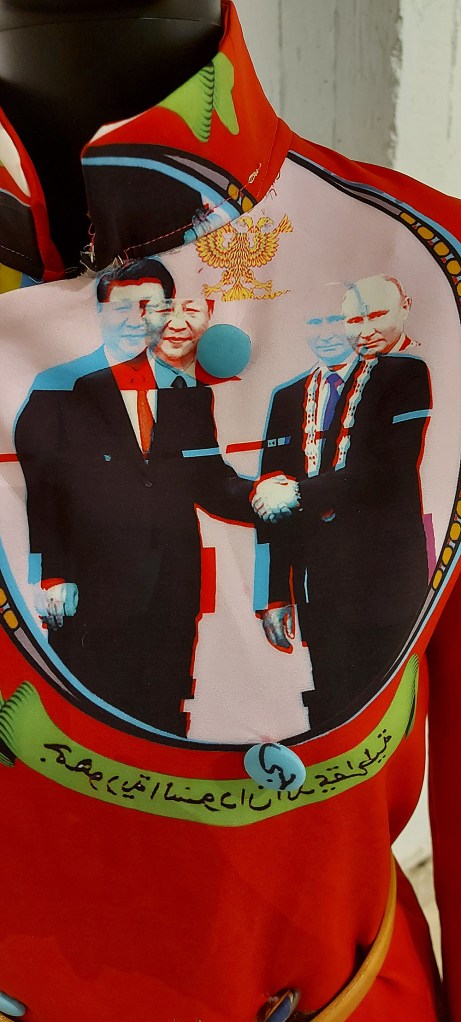 They have produced a show which is aesthetically satisfying but also thought-provoking and at times challenging. Khaled’s portraits of people in East Africa are composited onto striking colourful backgrounds, while Al Fadni’s digital collages are printed onto fabric which is then worn by the model in his photographs.