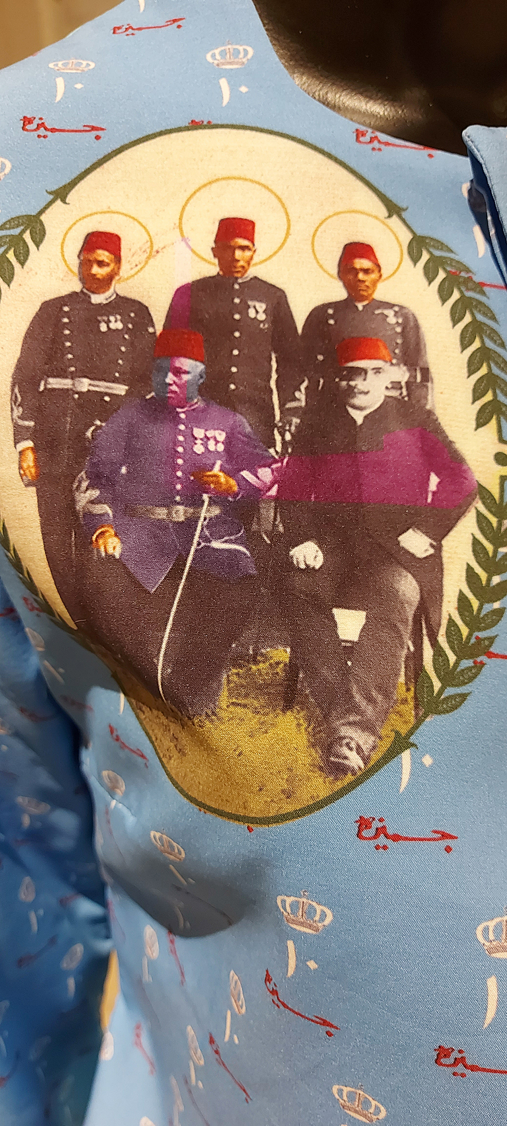 The concept of work was essentially based on two elements: the Askari archived colonial photos and uniforms, and the concept of a pattern language that emerged in the African culture through the Dutch wax prints. The Dutch prints / Ankara (West African textile) were represented by the Netherlands to the Dutch Gold Coast (Ghana) that was later extended to the West African market. The printed fabrics quickly integrated themselves into African apparel, women used the fabrics as a method of communication and self-expression, integrating colours, shapes, and visual elements such as patterns and icons that created a shared language and widely understood meanings. Following the same tradition, the artist created his own Dutch prints and used them as a medium to communicate his ideas. AlFadni revives their long-forgotten voices through his ciphered patterns that reveal the never-ending exploitation of the Sudanesepeople from the earliest times to the present day.
