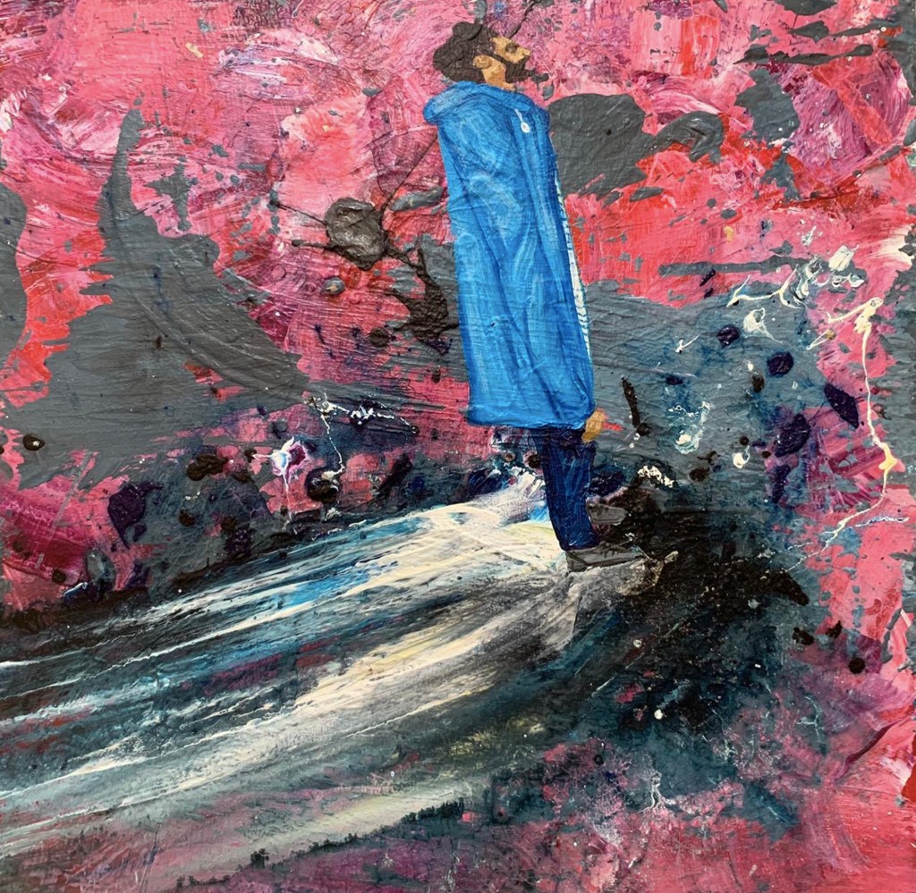 In Part 2, the ‘Figure’ appears. This bearded male is clearly Rashed himself, if you’ve ever seen him. But of course, the Figure is Everyman (and woman), yet the artist can only genuinely express his own feelings and sensations – and make them available and recognizable to the viewer. Rashed stands in an abstract wasteland, peering uncertainly around him at the expanse of red or blue, seas of uncertainty, deserts of questions. Or he is caught in a vortex, being buffeted around in a swirling wind or sea – destabilization and formlessness.