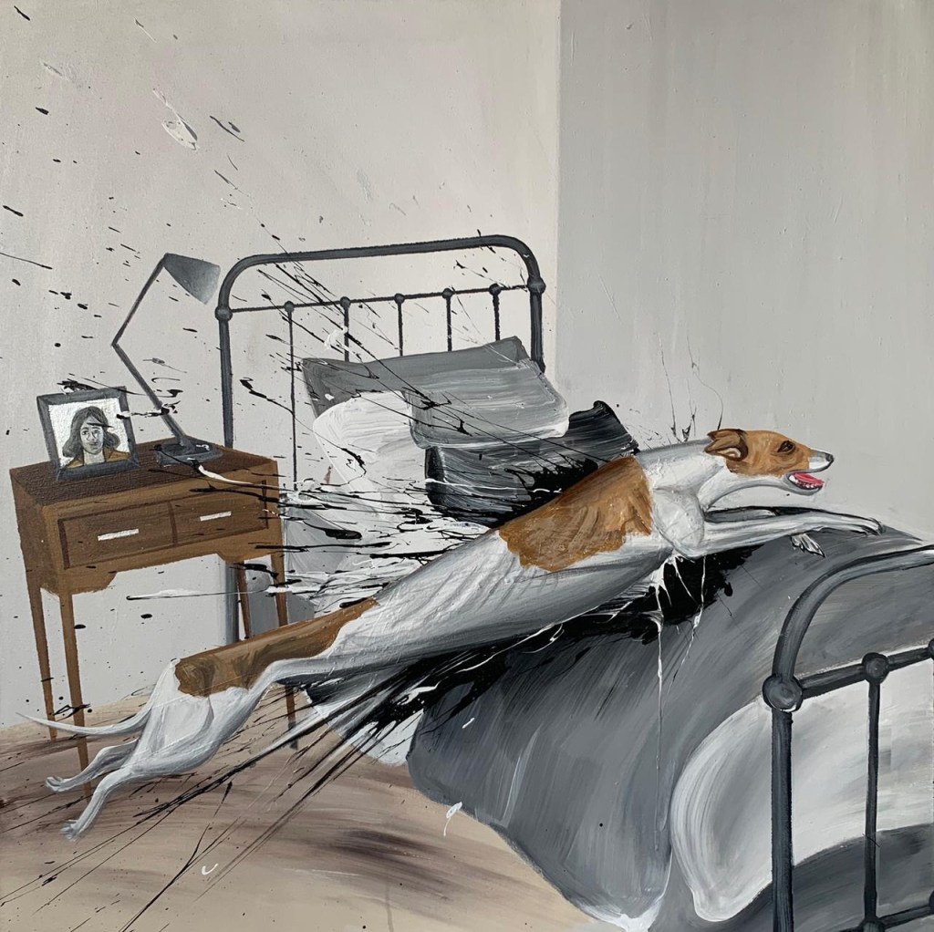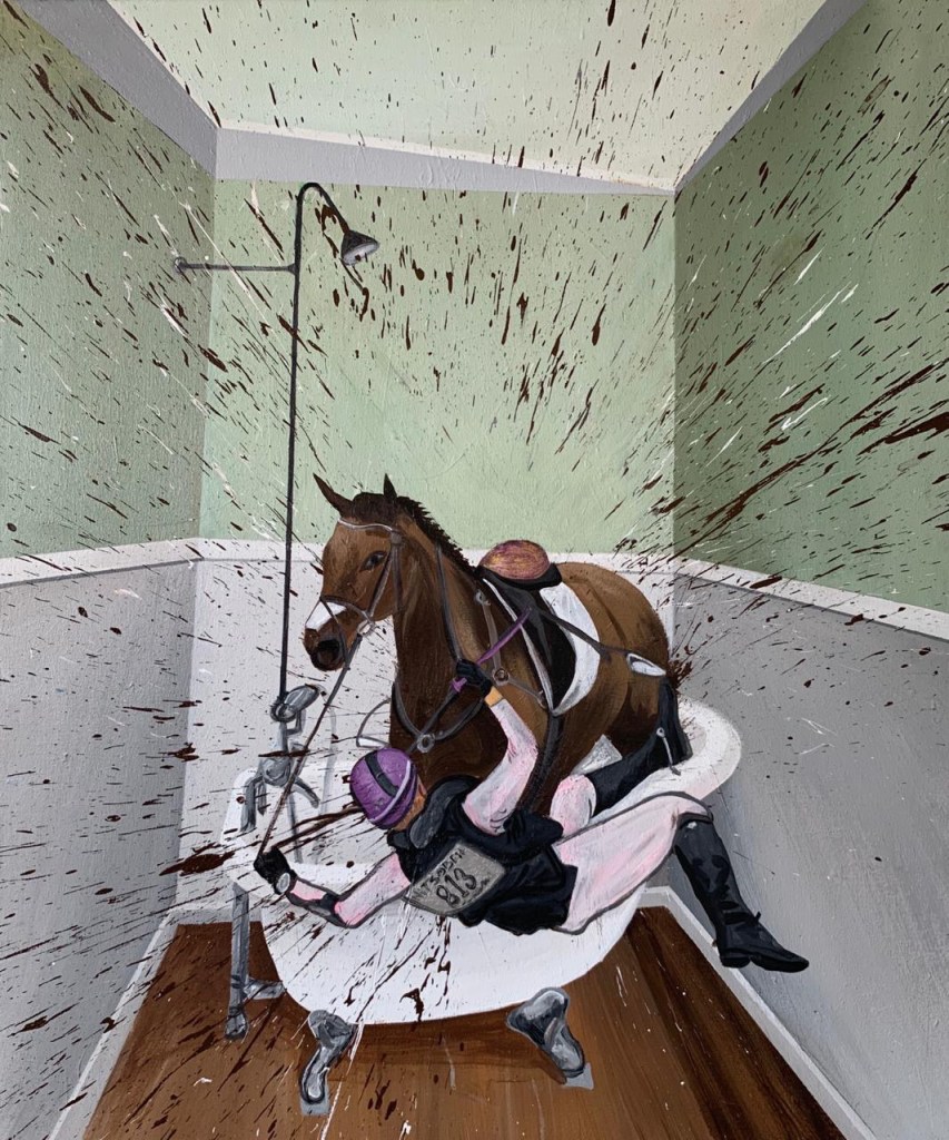 Finally, we arrive at Part 4, The Room. These are the images that made me think of the Edward Hopper meme. Because they look like Edward Hopper paintings in which something has exploded. Here Rashed’s pop art sensibility bursts out in an exuberant release of frustration, darkly comic and exquisite. A horse and its jockey take a hectic shower together in a small bathroom; a man watches an EgyptAir plane crash softly onto his bed. The bed is the site of many activities, including a boxing match, football games and a bicycle race. Here Rashed expresses perfectly that feeling of confinement we became so familiar with. Certainly, the imagination cannot be confined, yet it is tempered by and must acknowledge the absurdity of being just stuck in a room. The world explodes into Rashed’s Hopperesque life, raucously, uncomfortably, ridiculously. My favorites are the large dogs that plunge into the pictures, creating canine mayhem