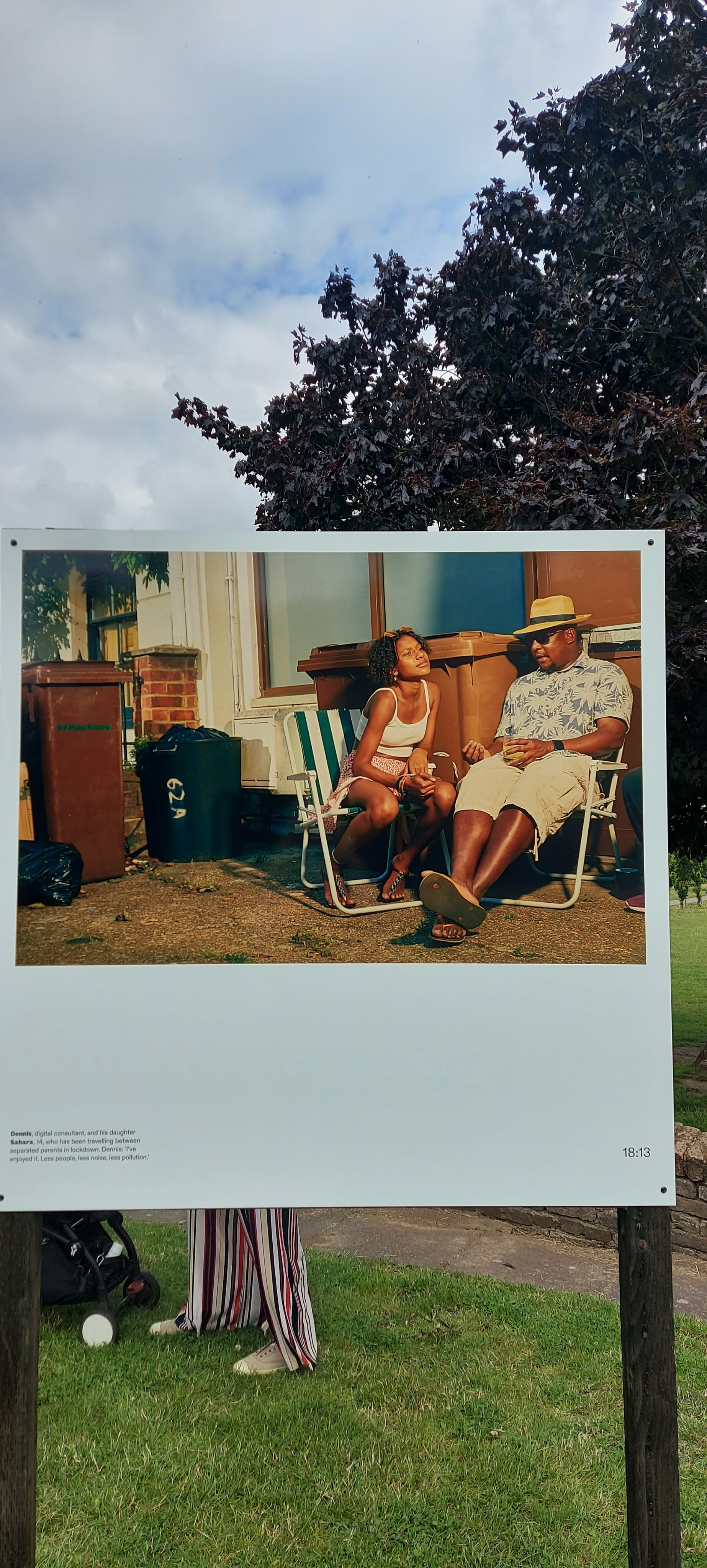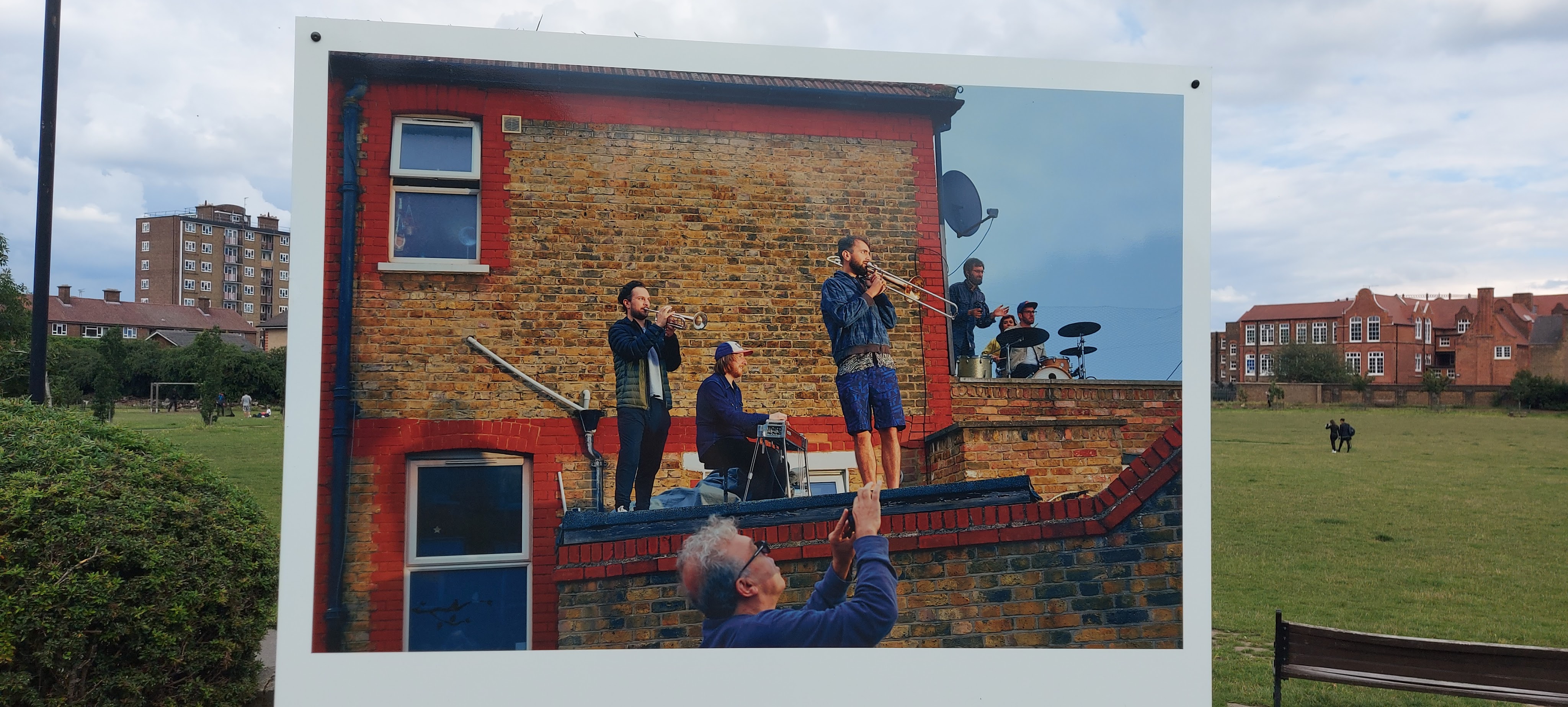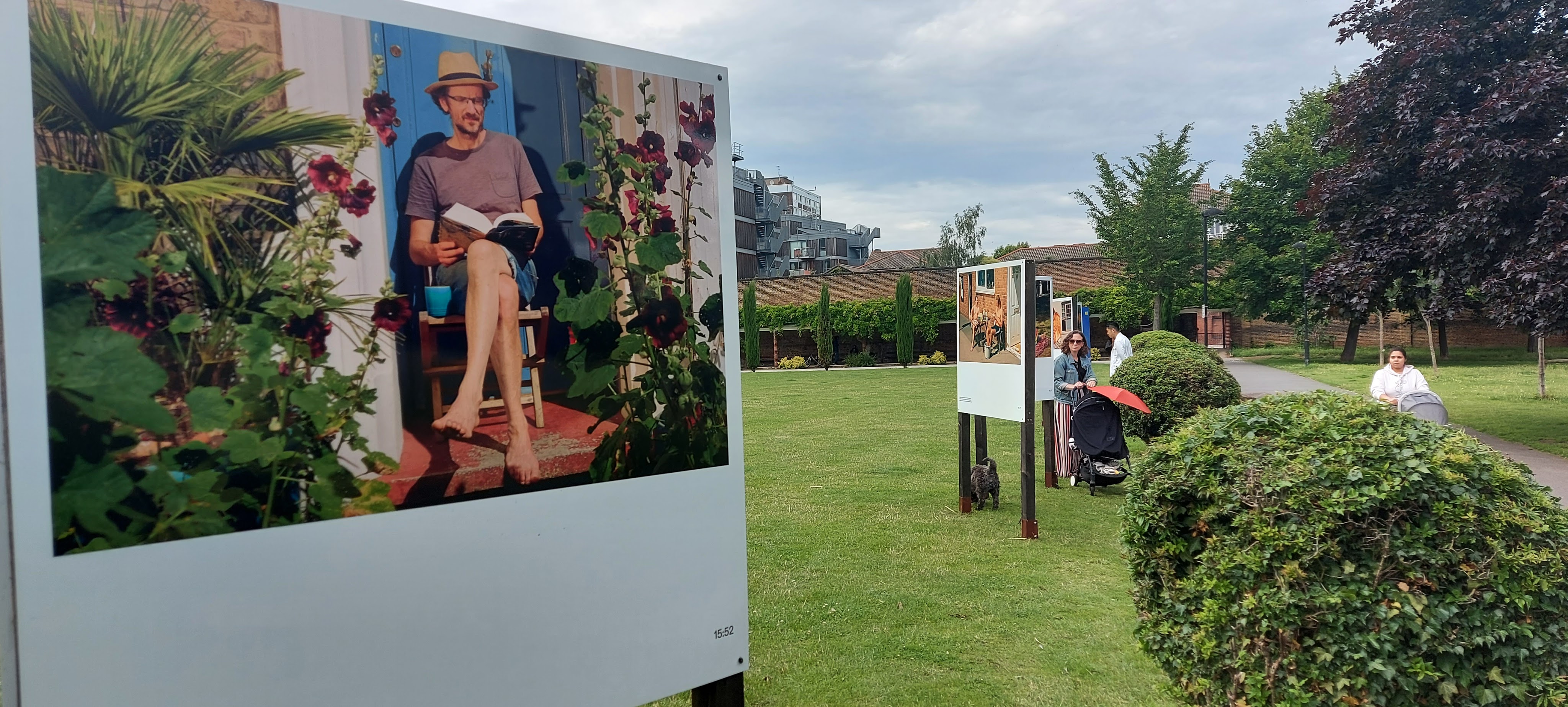 That’s why Olivia Harris’s photography installation at Haggerston Park in London E2 is so enjoyable and fascinating. In a series of large, colour photographs, she captures the way people in the neighbourhood coped with enforced isolation. She photographed them in their gardens, stairwells, rooftops. She shows both the isolation and the joyous moments when people were able to come together.