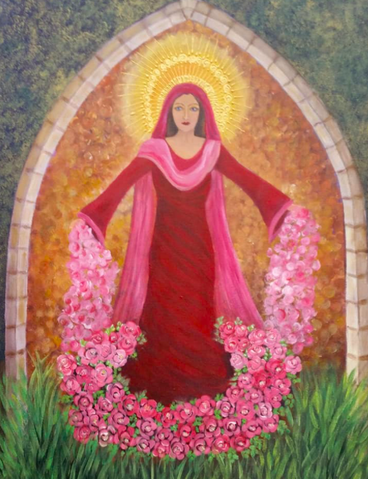 Some of it I liked and some I emphatically did not. I was rather taken with the work of Sandra Brant, a local artist who was showing her work at the tiny, beautiful St Margaret’s Chapel and Almshouses. I bought a giclée print of one of her paintings, which is very much in the tradition of English folk art but also reminded me of the Mexican folk images of the Virgin of Guadalupe. We had a wonderful chat about Dion Fortune, too.