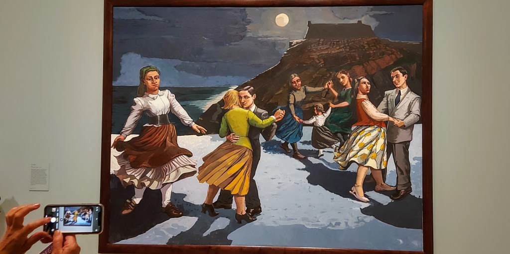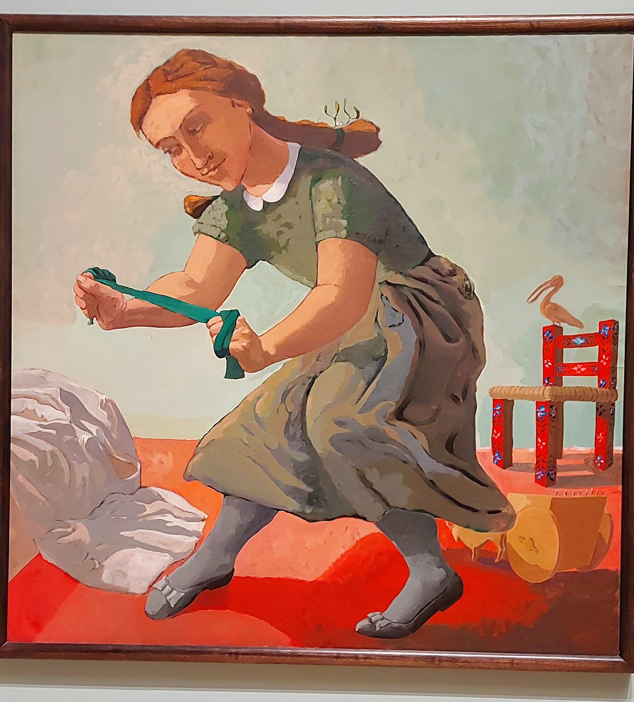 The Dance (1988) is possibly the real centrepiece of the show. At a slightly mysterious moonlight party, held outdoors on a cliff face overlooking the sea, two couples dance, a trio of women – one. small child – dance together and another woman dances alone. Most of the dance seem to be preoccupied, with the dance or their thoughts. The man at the centre glances sideways, almost slyly. The woman at the left, who appears larger than the rest, stares right out of the canvas at the viewer. It is apIning that holds within it many potential narratives, from a retelling of an old fairy take to a modern romantic comedy – or tragedy. Rego allows the viewer to indulge their imaginations in the ambiguous story.
