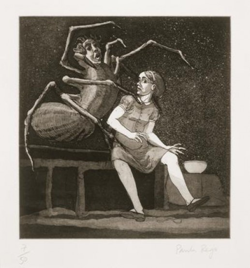 in the 1980s, Rego’s paintings began to centre upon fiercely independent, rebellious girls. Rego depicts them challenging oppressive social norms and expressing female sexual desire. The characters also represent the artist’s inner world, reflecting her interest and engagement with, psychotherapy. Rego explained, ‘it was very important to go to the origin, the imaginative origin that provides the images of what we have inside us, without us knowing what it is’.