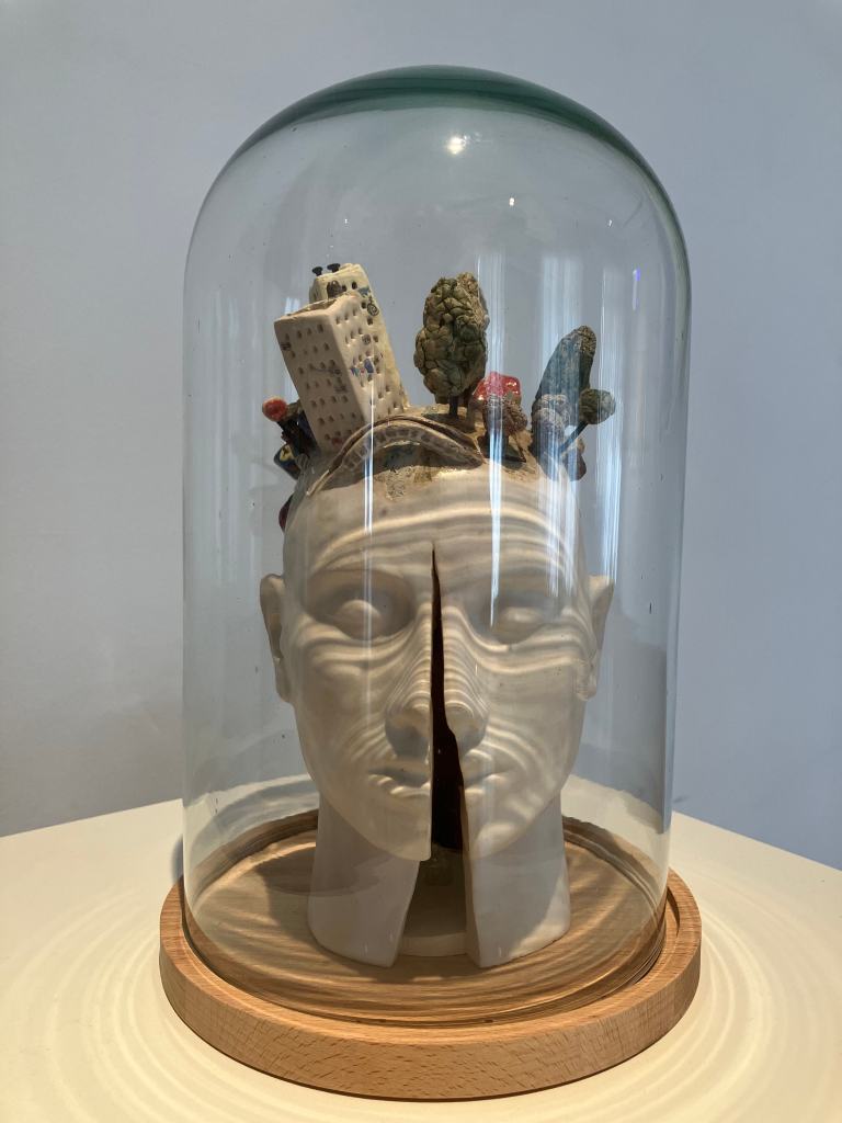 The first piece Glava (head) is a repeated motif throughout the work. It is a ceramic head, split down the middle from the bottom. The crown is topped by a diverse array of structures – trees, buildings, a bridge – everyday things that we see and store in our memories. How do we remember how to get home? Because we learn the environment. It’s all stored in the head! The head is in a glass case like a preserved piece of Victorian taxidermy.