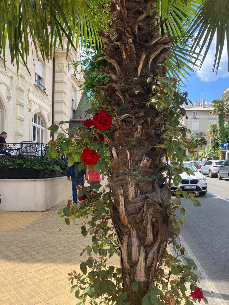 The architecture is largely Belle Epoque but not all of it. Modernist buildings are also present, even some from the Communist era. One thing that was particularly lovely was the way they have planted roses to climb up the trunks of the palms! The roses scent the air, which combines with the sea air – heady and beguiling!