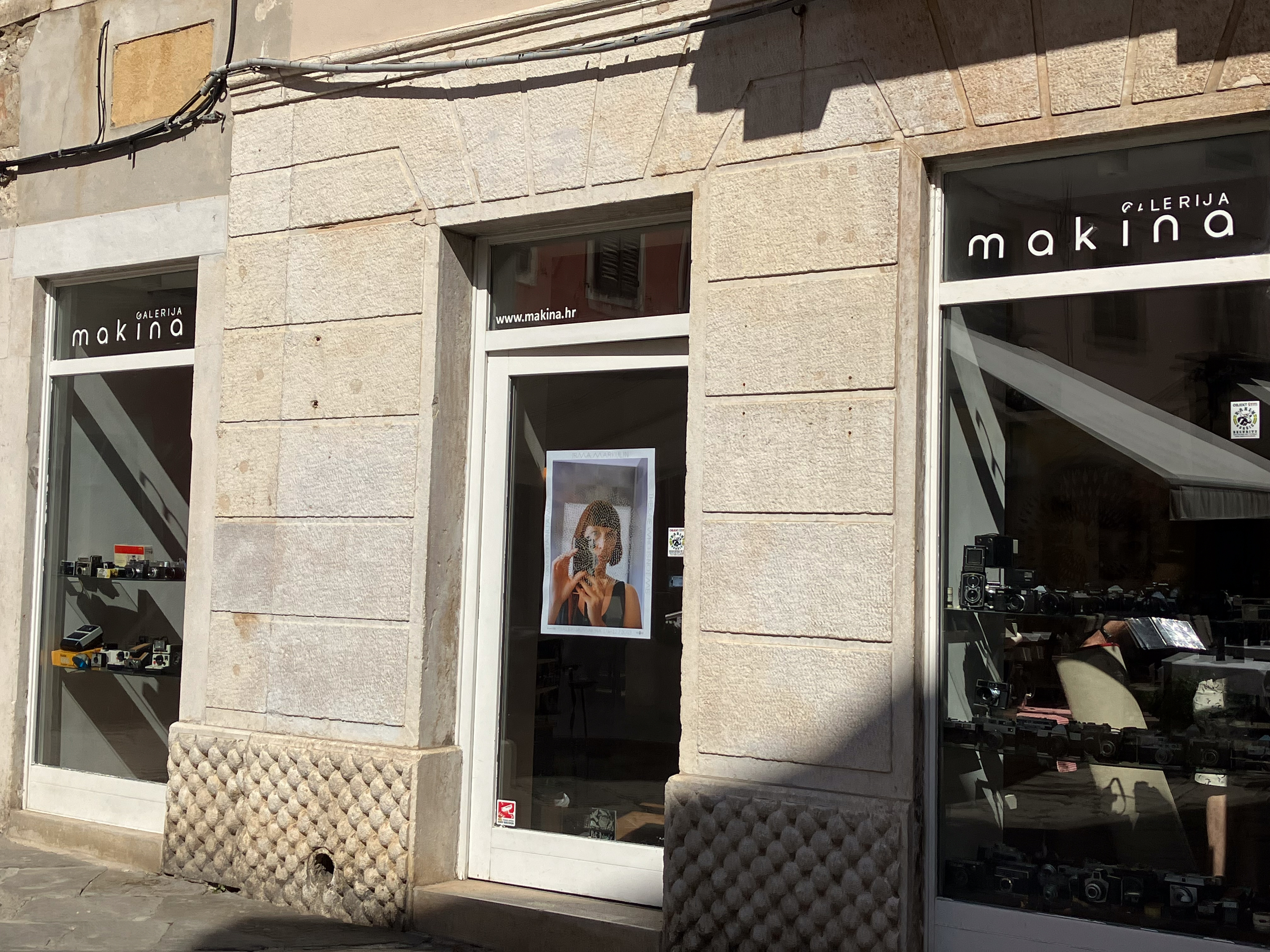 Walking around I noticed that the city’s historic area, dominated by Mediaeval and Renaissance structures, is still paved in ancient Roman paving stones. There were a number of small galleries in the old town and a few looked pretty interesting. I stumbled across the Galerija Makina, which was striking because of the window display of ancient cameras.