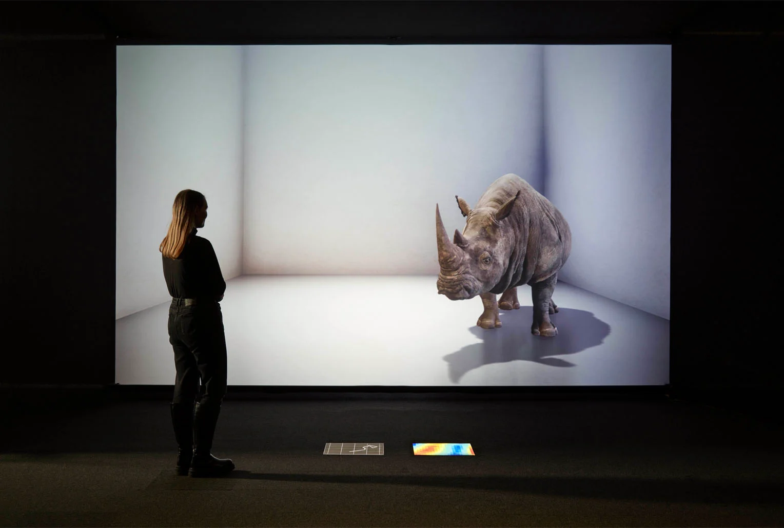 Ginsberg’s “The Substitute” addresses the paradox of how we care so much about making new life forms while ignoring the ones we already have. A northern white rhino is digitally “brought back to life” in the piece, presented as a life-sized projection. Based on research from AI lab DeepMind, the rhino acts like an artificial agent, which means it can learn from its surroundings on its own. The faux rhino roams in a virtual world, becoming more “real” as it learns the limits of the place it inhabits. Over time, the rhino is ‘born’ out of a mass of pixels, strides across the screen and becomes ever more uncannily real. Until it vanishes. The moment of vanishing is terrible and devastating. It brings home the death of Sudan and all the other species we have wiped out. The mass of pixels appears again, and gradually, a new rhino is ‘born. But by now, we know how false it is and what we have done.