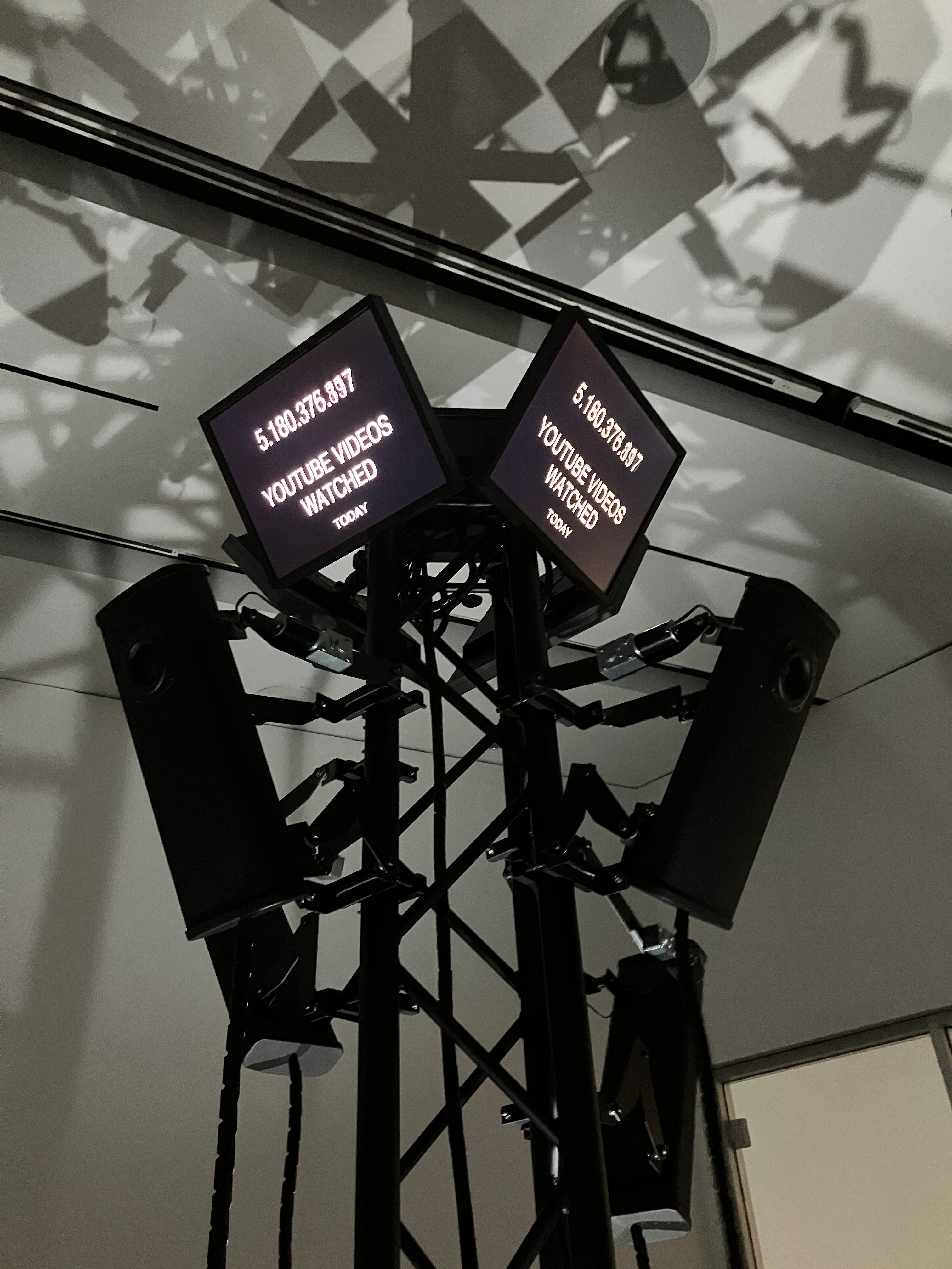 The sculptures are driven by algorithms showing dynamic counters of data consumption and cyberattacks: from Facebook likes, Google searches, tinder swipes, internet energy consumed and emails sent to the adverse cyber events happening in real time. The data is analyzed and translated into sound. Based on the idea of surveillance Capitalism and behavioural modification through data appropriation, the APES are programmed to move with predictive patterns dictated by the various names appearing on the screens. These motions are accompanied by an evolving soundscape generated by a granular synthesizer driven by the data flows. When they counters hit certain key numbers, the sculptures release sonic events composed by an AI trained to deep fake the calls of real apes. These sonic events are modulated in real-time by the data speed and diffused as a quadraphonic audio experience using the body of the APES as a resonating chamber.