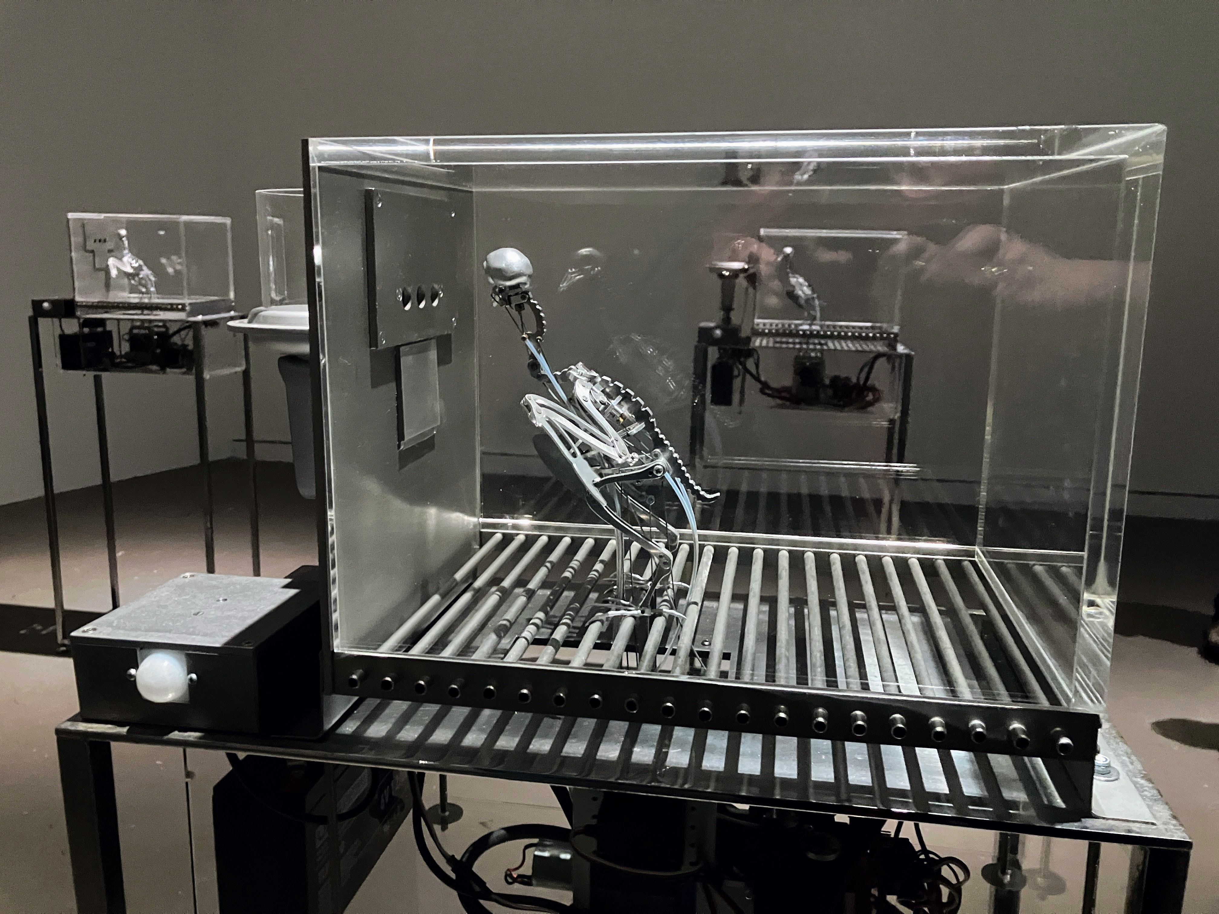 Anyway, I had actually forgotten about Skinner until I walked into Collishaw’s impressive and aesthetically beguiling installation. The room was filled with “Skinner Boxes” rendered as small silver bird cages where exquisite mechanical birds perched, spread their wings and generally behaved in a birdlike manner. I was captivated, reminded of the beautiful mechanical birds of the 18th century, the jewelled automata. At varying times the cages holding Collishaw’s birds would open up a small drawer and the bird would peck at it. The curator, Sarah Joyce, explained to us viewers that the birds in the real experiment were subjected to random rewards, and got addicted to the anticipation of reward.