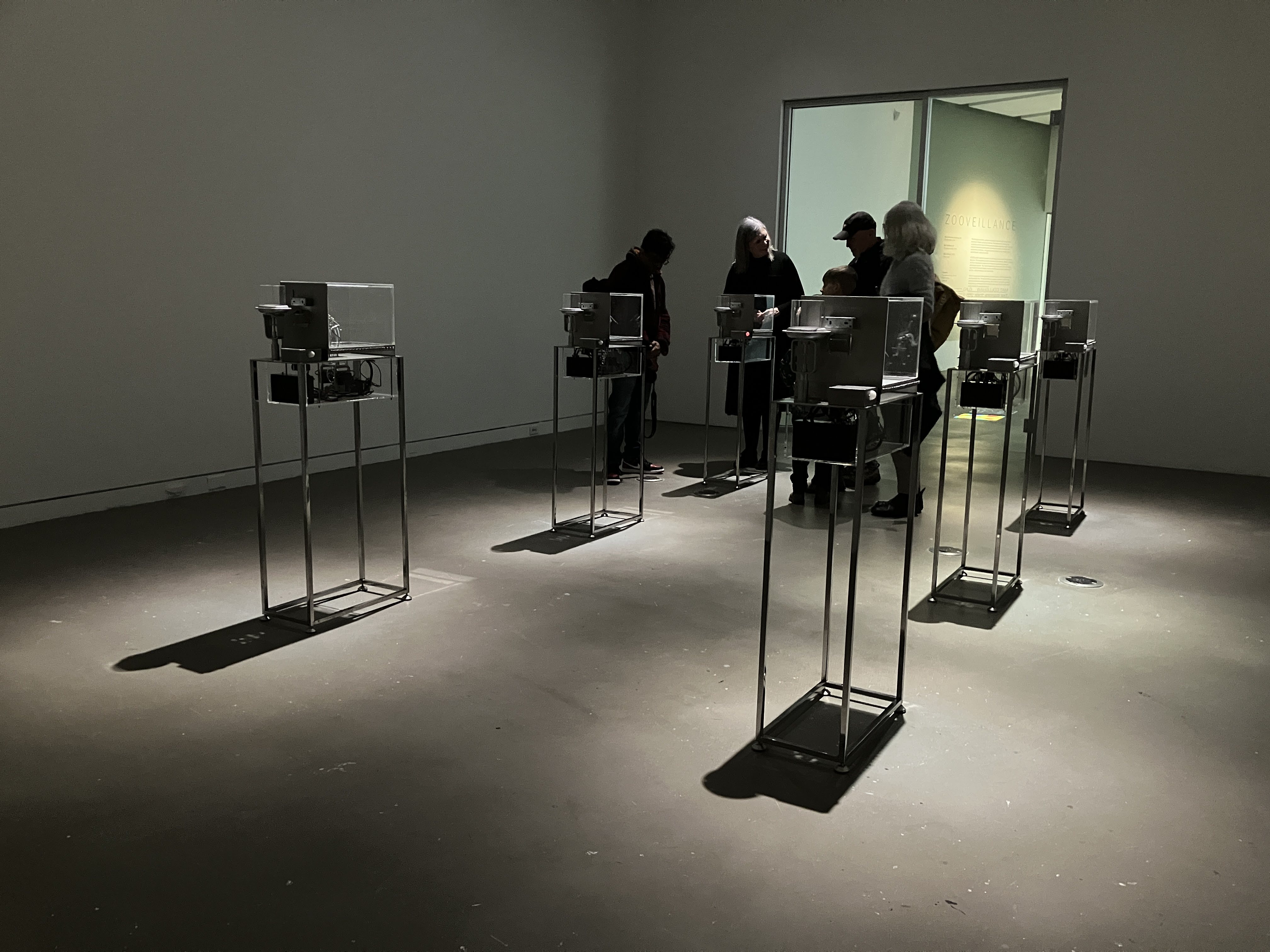ZOOVEILLANCE is the current exhibition’s title, which exemplifies the contradiction of contemporary technological advancement through the mediated observation of animal activity. Artists Alexandra Daisy Ginsberg, Mat Collishaw, and Marco Barotti have developed their contributions to the show. All are based on rigorous scientific, aesthetic and technological research. The artworks address our collective concerns about two powerful, hyper-transformative technologies: AI and Social Media . These emerged of at the tail end of in the 20th century and have been huge disruptors, and now dominate our present condition.