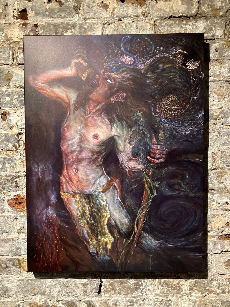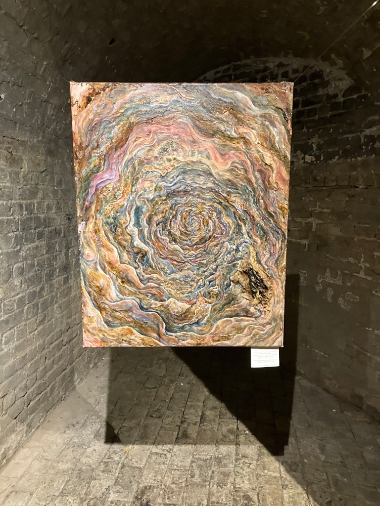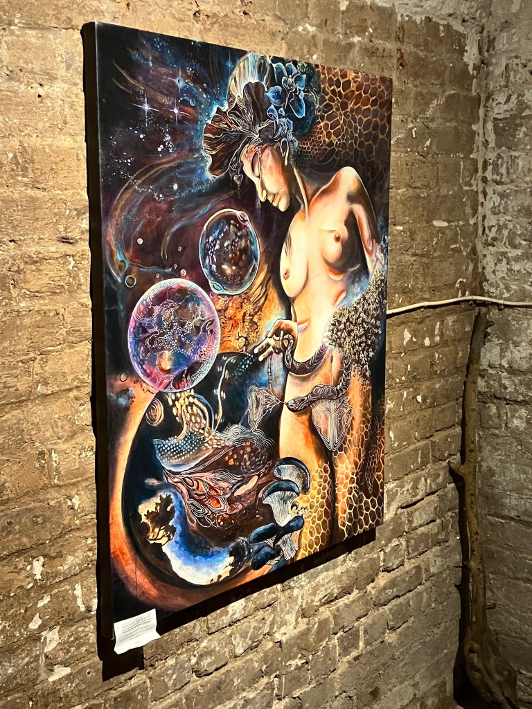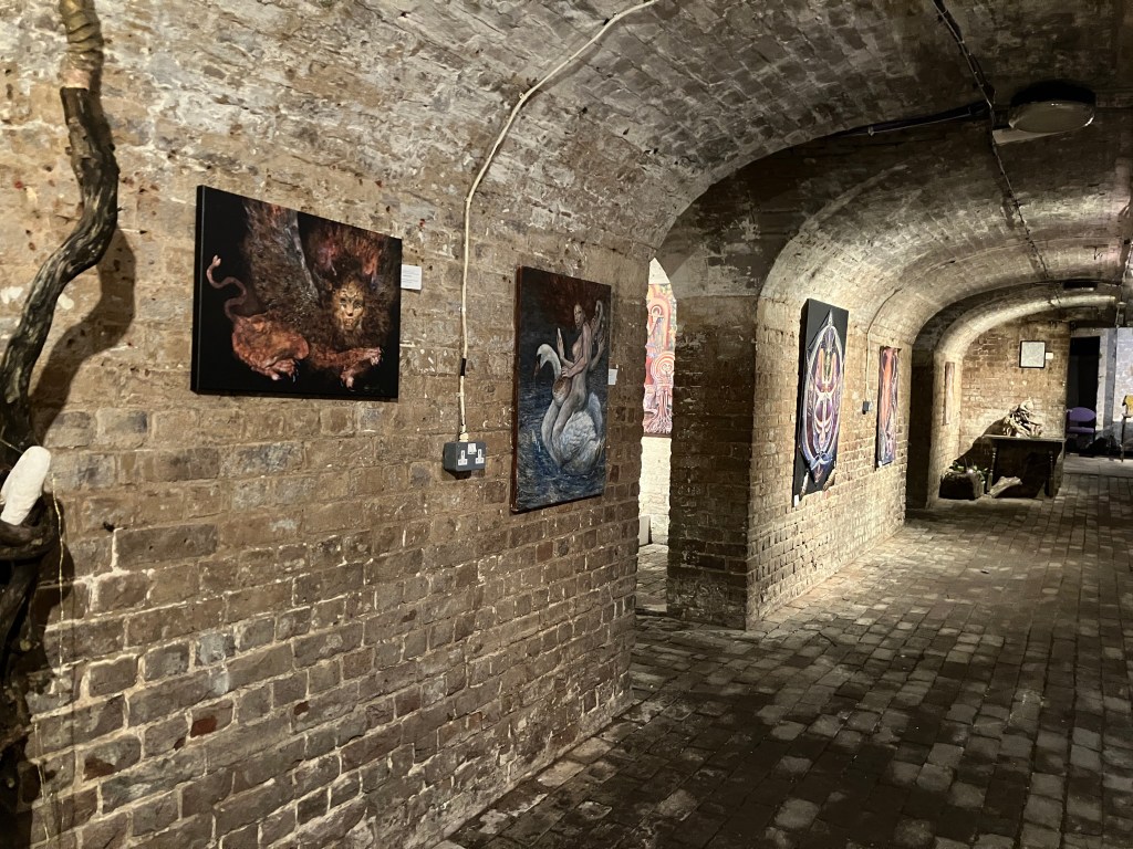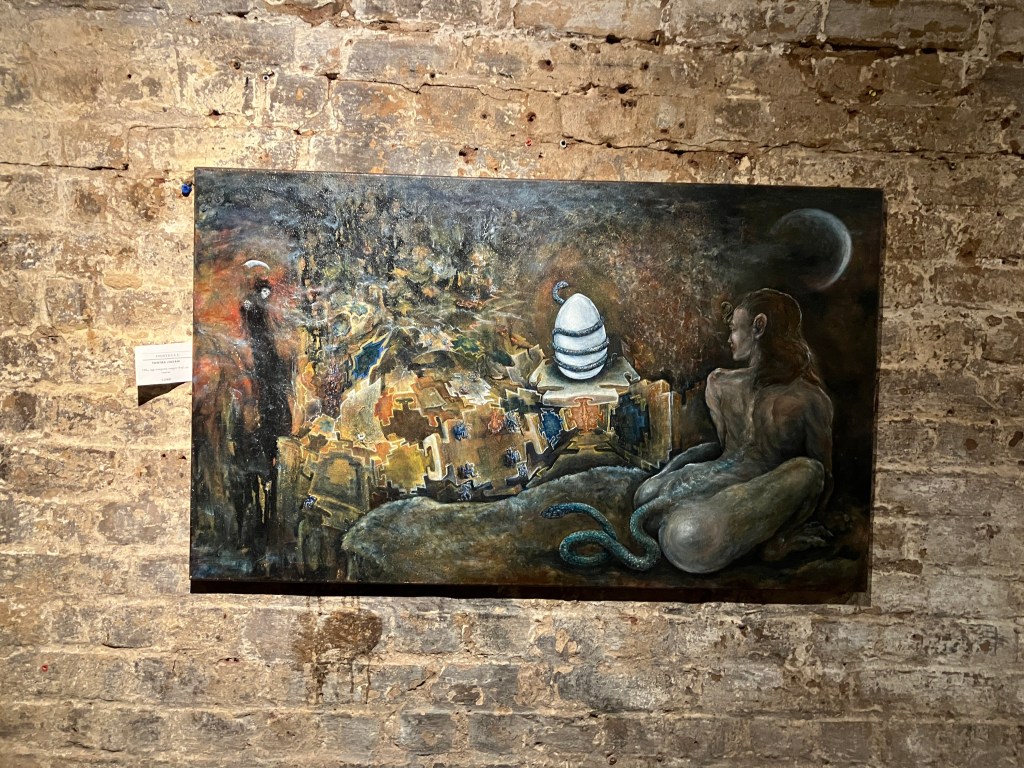 Visitors to this page probably already know I am a huge fan of Oryelle and Melissa, whose work I admire and highly recommend. Fortunately, they made it to London to present a gorgeous exhibition at the atmospheric St Pancras Crypt Gallery. While I spent a wonderful evening there, enjoying the work and Orryelle’s performances, I was so busy I did not have an opportunity to write up the show. It was – as expected – glorious. Orryelle is a master of virtually everything – painting, sculpture, film, and performance. And he plays music. Melissa created and curated the show with delicacy and care. Her luminous paintings – with their meditations of birth, life, and death – fit perfectly in the gallery’s strange but resonant environment. As the exhibition invitation promised, it delivered: