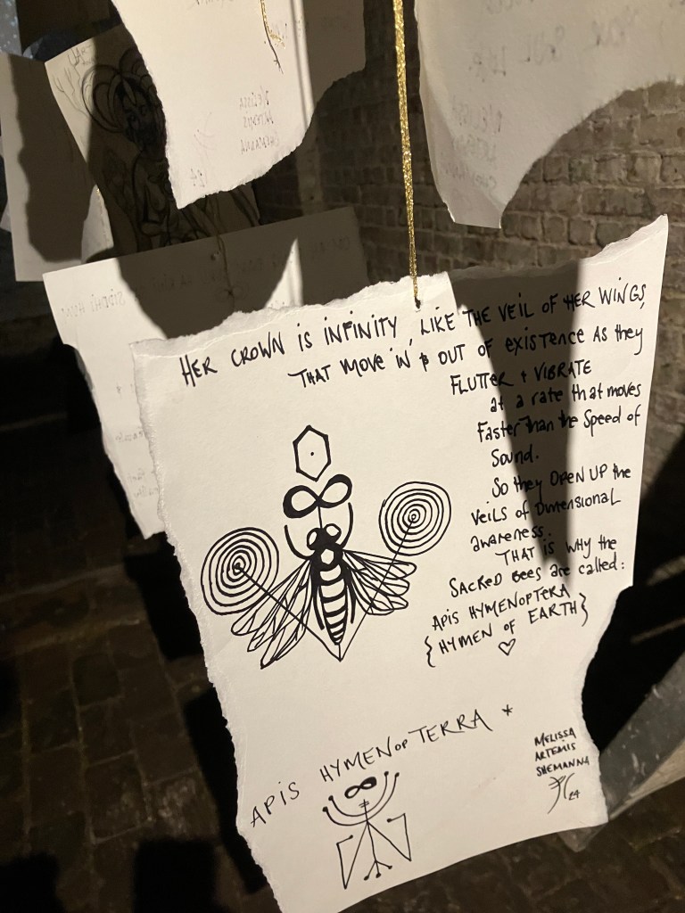 An exhibition of original oil & tempera grassa paintings atmospherically lit on antique cavern like walls. Sculptures of clay, wood, bronze and dripping honeycomb are installed throughout the labyrinthine space, revealing the magic and mystery of natures sacred essence. Hanging poetry and inspiring prose written on paper and silken fabric -is an invitation to meander through a sensuous foray for contemplation. Projections of telluric images evocative of the mythic glyphs of our universal mother tongue, flicker on the walls of the earthen womb, taking you beyond time and space into the numinous dreaming, regenerative symbols and sigils revivify the font of Mnemosyne to remember what we have long forgotten. These sacred intentions brought to form and presented within a magical container, offer a precious way of relating to the living myth within us all.