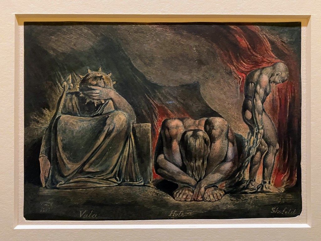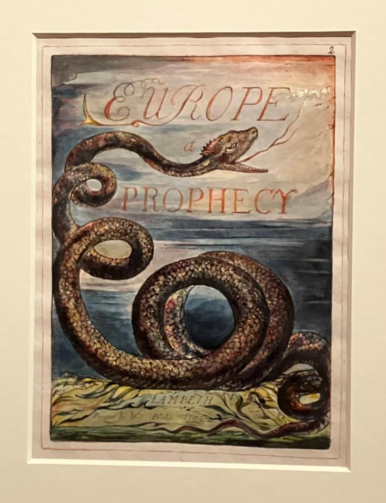‘William Blake’s Universe’ was well worth the trip. Even though I’d seen the wonderful 2020 exhibition in Tate Britain, Fitz’s show told me things about Blake I didn’t realise and helped me to think about him and his work in new ways. Also since 2020 I have read Marsha Keith Schuchard’s book Why Mrs Blake Cried: William Blake and the Sexual Basis of Spiritual Vision . This is highly interesting: the books makes clearer links to and better explanaitons of the occult and mystical circles in London in which Blake and his friends moved, fomr the Swedenborgians and the Moravians to the outright alchemists.