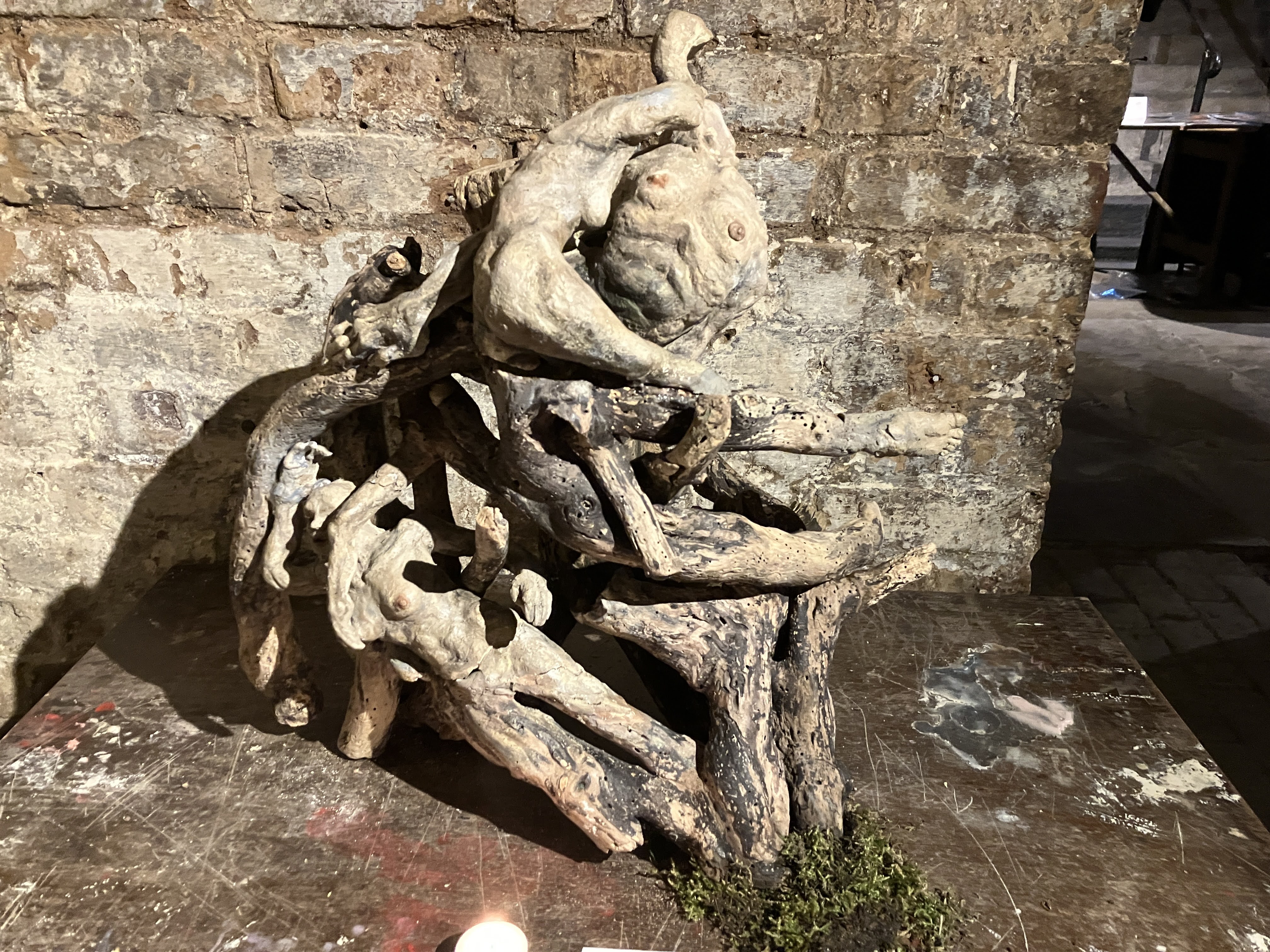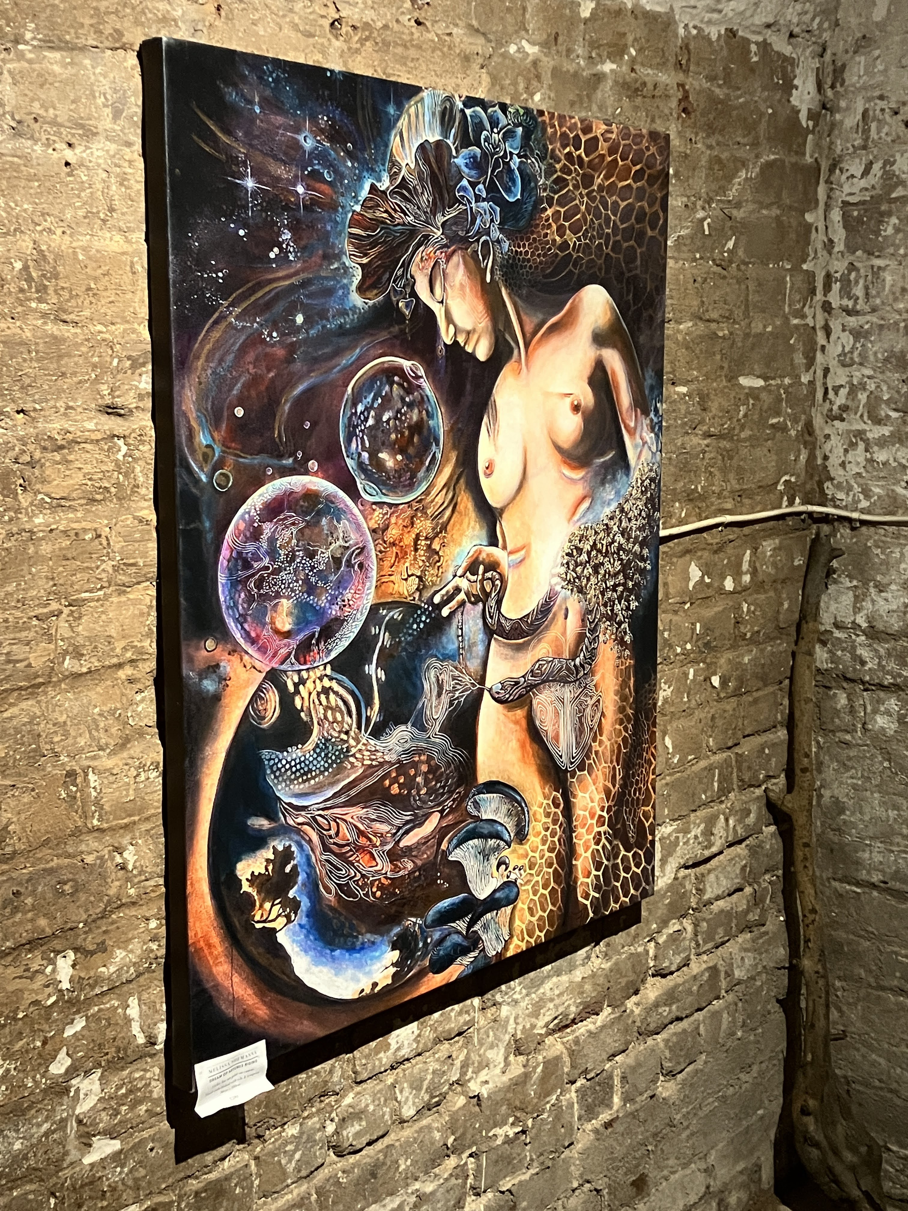 An exhibition of original oil & tempera grassa paintings atmospherically lit on antique cavern like walls. Sculptures of clay, wood, bronze and dripping honeycomb are installed throughout the labyrinthine space, revealing the magic and mystery of natures sacred essence. Hanging poetry and inspiring prose written on paper and silken fabric -is an invitation to meander through a sensuous foray for contemplation. Projections of telluric images evocative of the mythic glyphs of our universal mother tongue, flicker on the walls of the earthen womb, taking you beyond time and space into the numinous dreaming, regenerative symbols and sigils revivify the font of Mnemosyne to remember what we have long forgotten. These sacred intentions brought to form and presented within a magical container, offer a precious way of relating to the living myth within us all.