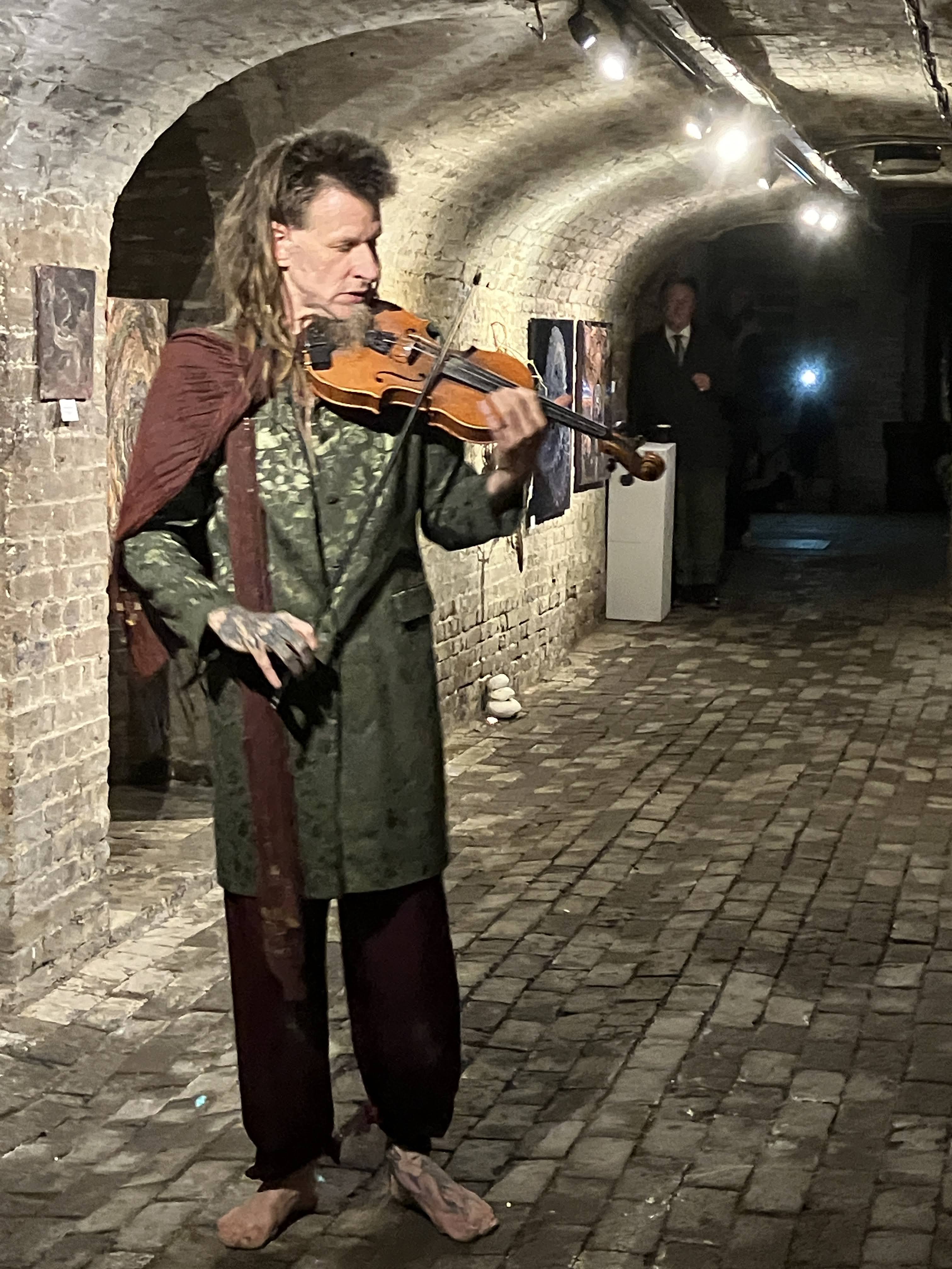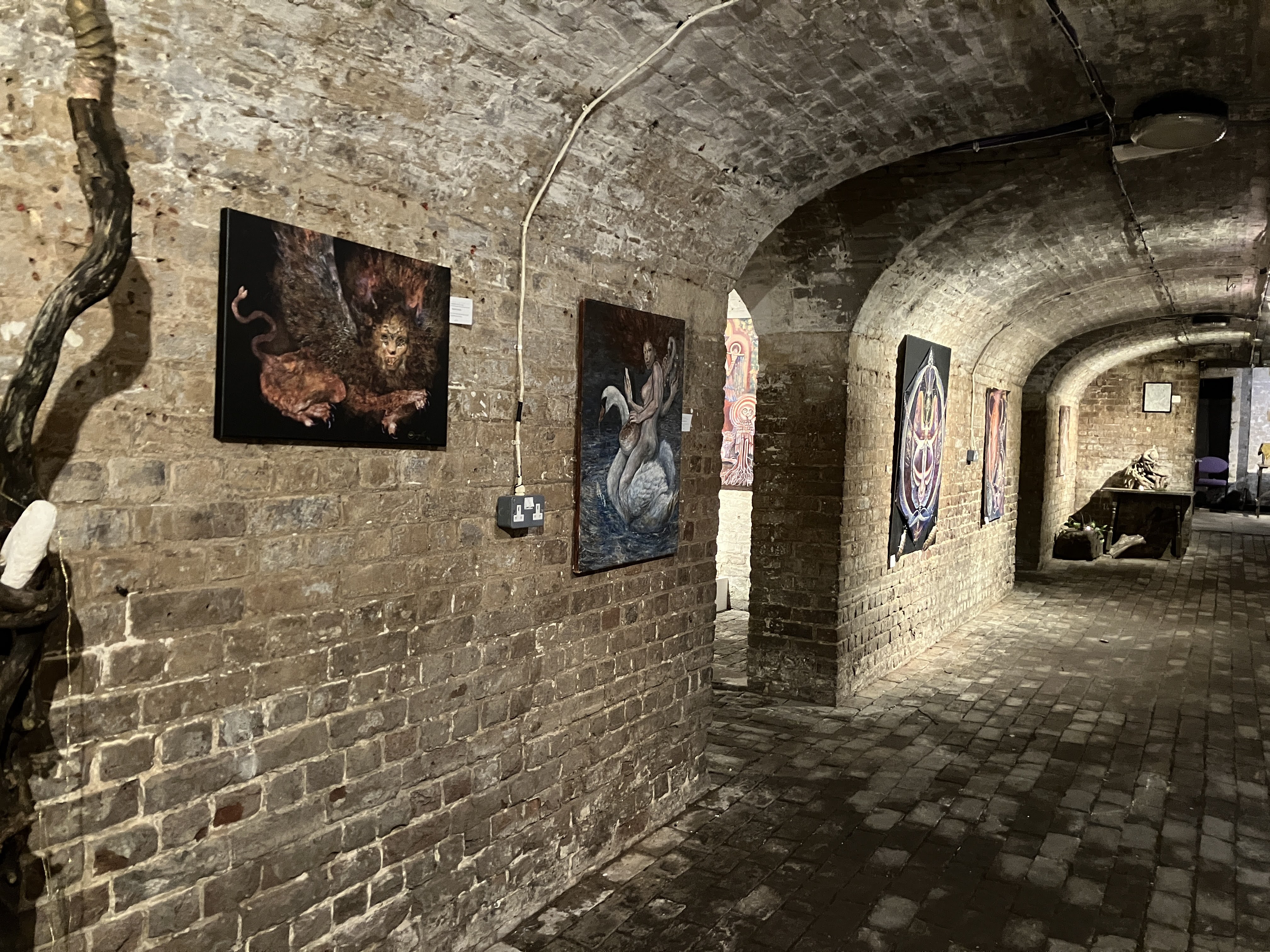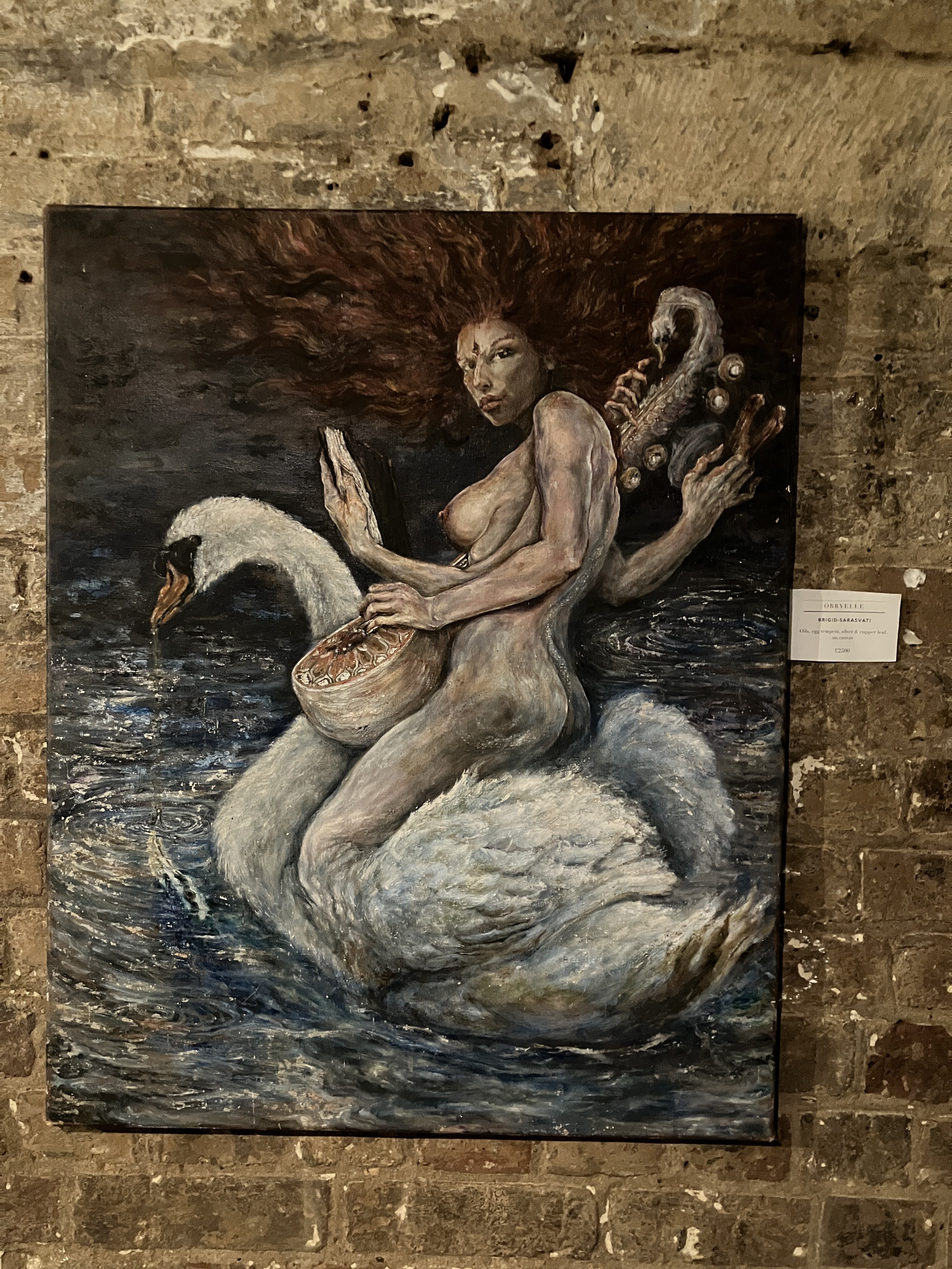 Visitors to this page probably already know I am a huge fan of Oryelle and Melissa, whose work I admire and highly recommend. Fortunately, they made it to London to present a gorgeous exhibition at the atmospheric St Pancras Crypt Gallery. While I spent a wonderful evening there, enjoying the work and Orryelle’s performances, I was so busy I did not have an opportunity to write up the show. It was – as expected – glorious. Orryelle is a master of virtually everything – painting, sculpture, film, and performance. And he plays music. Melissa created and curated the show with delicacy and care. Her luminous paintings – with their meditations of birth, life, and death – fit perfectly in the gallery’s strange but resonant environment. As the exhibition invitation promised, it delivered: