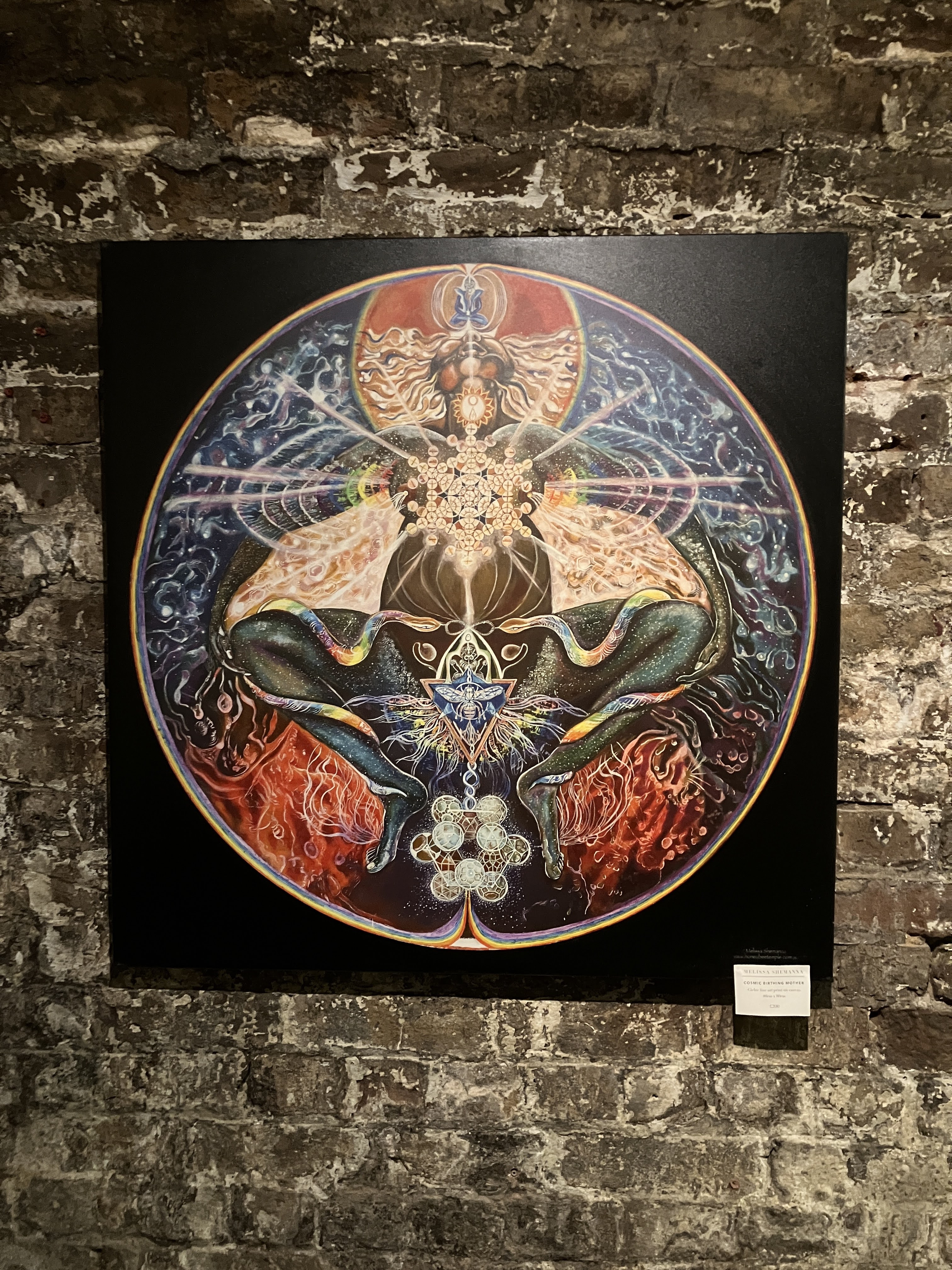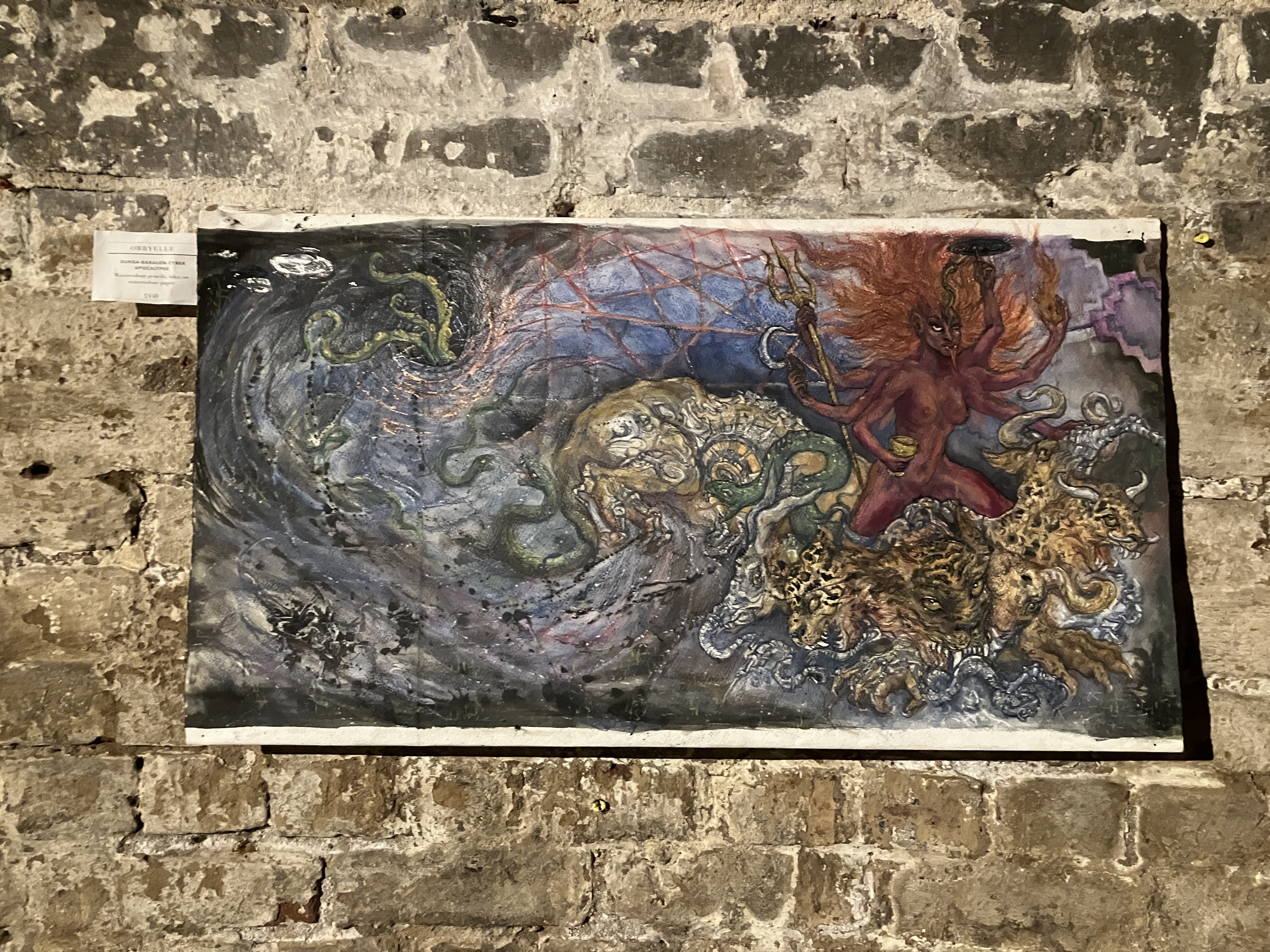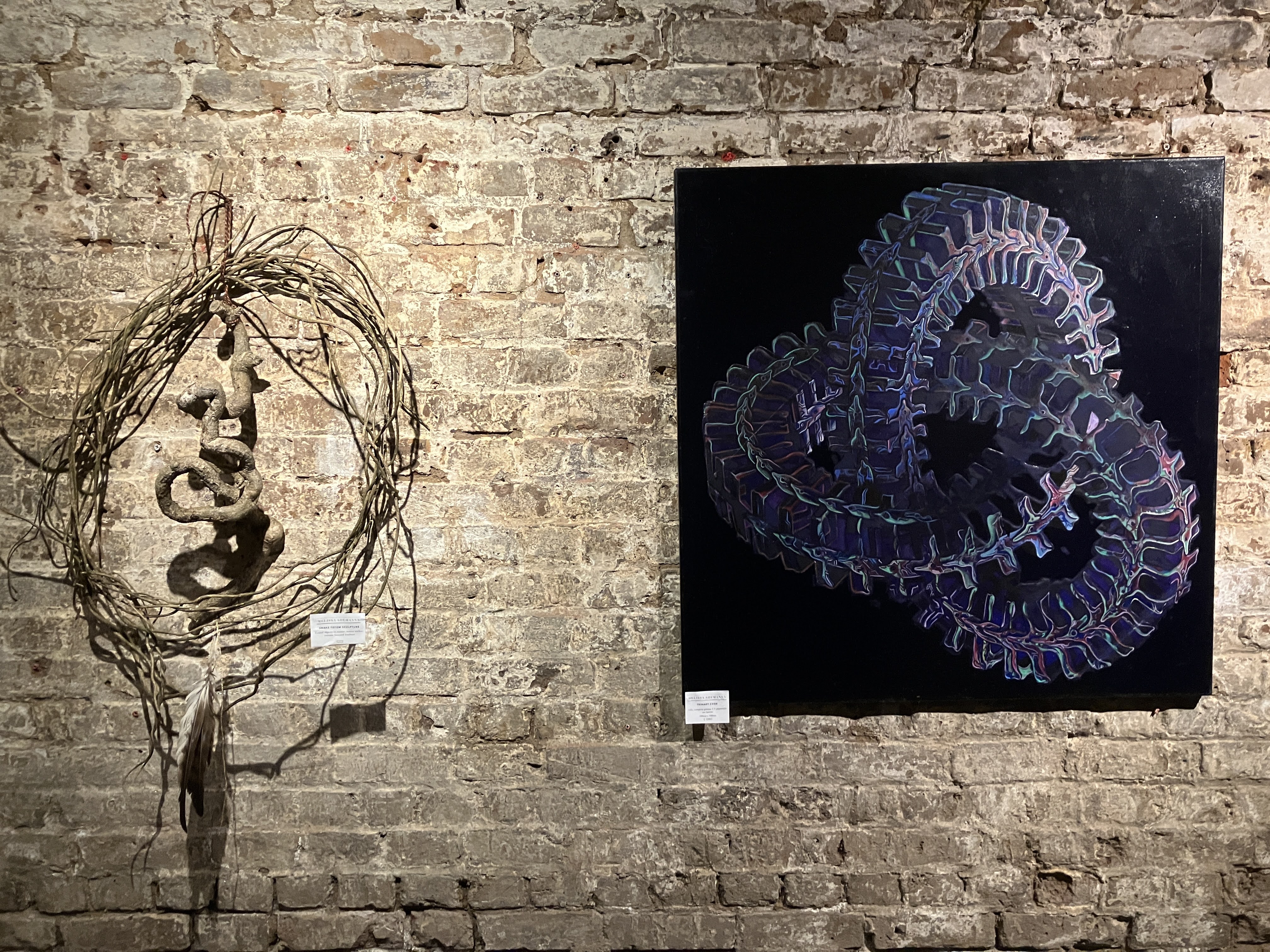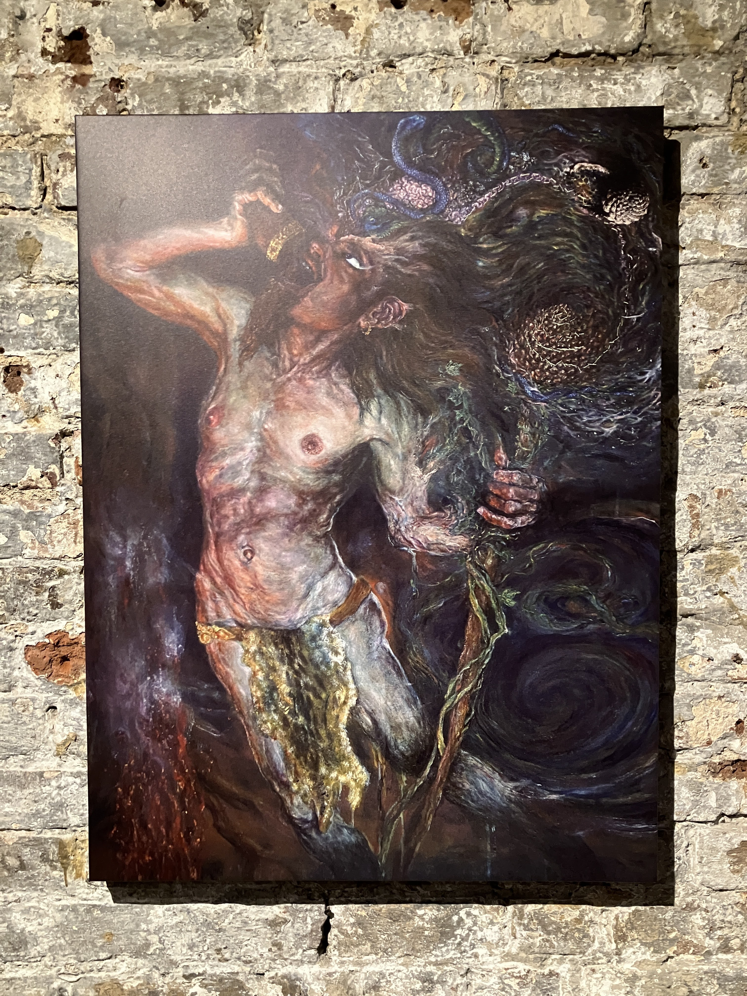 Visitors to this page probably already know I am a huge fan of Oryelle and Melissa, whose work I admire and highly recommend. Fortunately, they made it to London to present a gorgeous exhibition at the atmospheric St Pancras Crypt Gallery. While I spent a wonderful evening there, enjoying the work and Orryelle’s performances, I was so busy I did not have an opportunity to write up the show. It was – as expected – glorious. Orryelle is a master of virtually everything – painting, sculpture, film, and performance. And he plays music. Melissa created and curated the show with delicacy and care. Her luminous paintings – with their meditations of birth, life, and death – fit perfectly in the gallery’s strange but resonant environment. As the exhibition invitation promised, it delivered:
