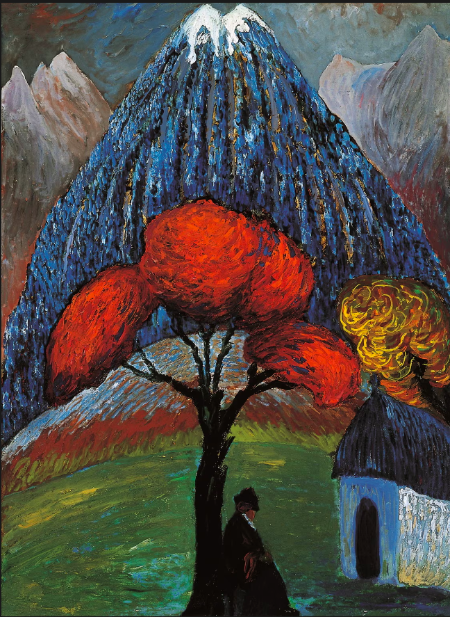 But despite owning a copy of the Blaue Reiter Almanac, I was less knowledgeable about Gabrielle Munter and Marianne Werefkin, two of the female artists in the group. The show brings them both to the forefront where they richly deserve to be, on a even footing with Wassily and Franz. No matter that art history sidestepped them a bit – they shine here. I particularly love Werefkin’s work. Munter’s vibrant portrait of her friend and fellow artist captures the alertness and charm she no doubt had. Ilya Repin’s earlier portrait (see below) does the same in a very different way. In her day, Werefkin was an important artist. A student of the great Repin, she made a mark on the Russian art scene before moving to Munich where she made contact with fellow Russian Kandinsky and then Marc and eventually joined with them in the Blaue Reiter. When the Great War broke out she had to flee to Switzerland where she participated in the Dada Cabaret Voltaire. But the end of the war and the Russian Revolution brought an end to Werefkin’s pension from her wealthy family. Not only that but her partner – artist Alexej von Jawlensky – left for her own lady’s maid. Suddenly impoverished and alone, Werefkin continued to paint. Living in Switzerland as a stateless person was not easy but in 1924 she formed another artist group Der Große Bär doing important exhibitions in Bern and later Berlin. She earned her living by painting posters and picture postcards and writing articles. The ‘Russian’ qualities of her work, which remained largely figurative, can be seen in her use of color – something she has in common with Kandinsky and Marc and her compatriot Natasha Goncharova.