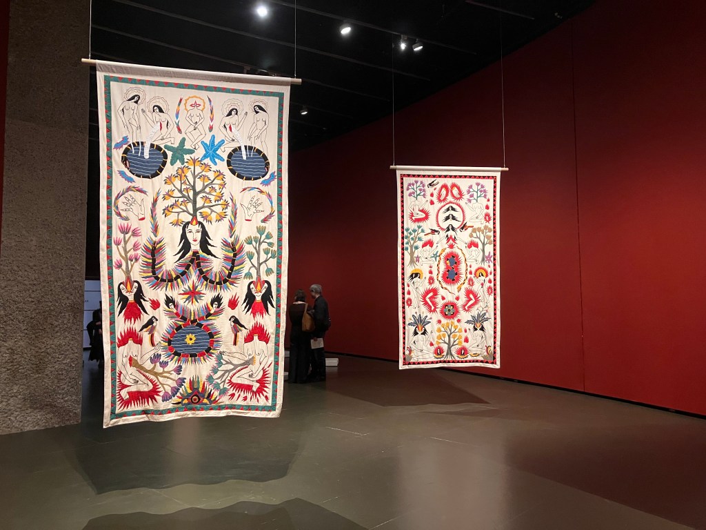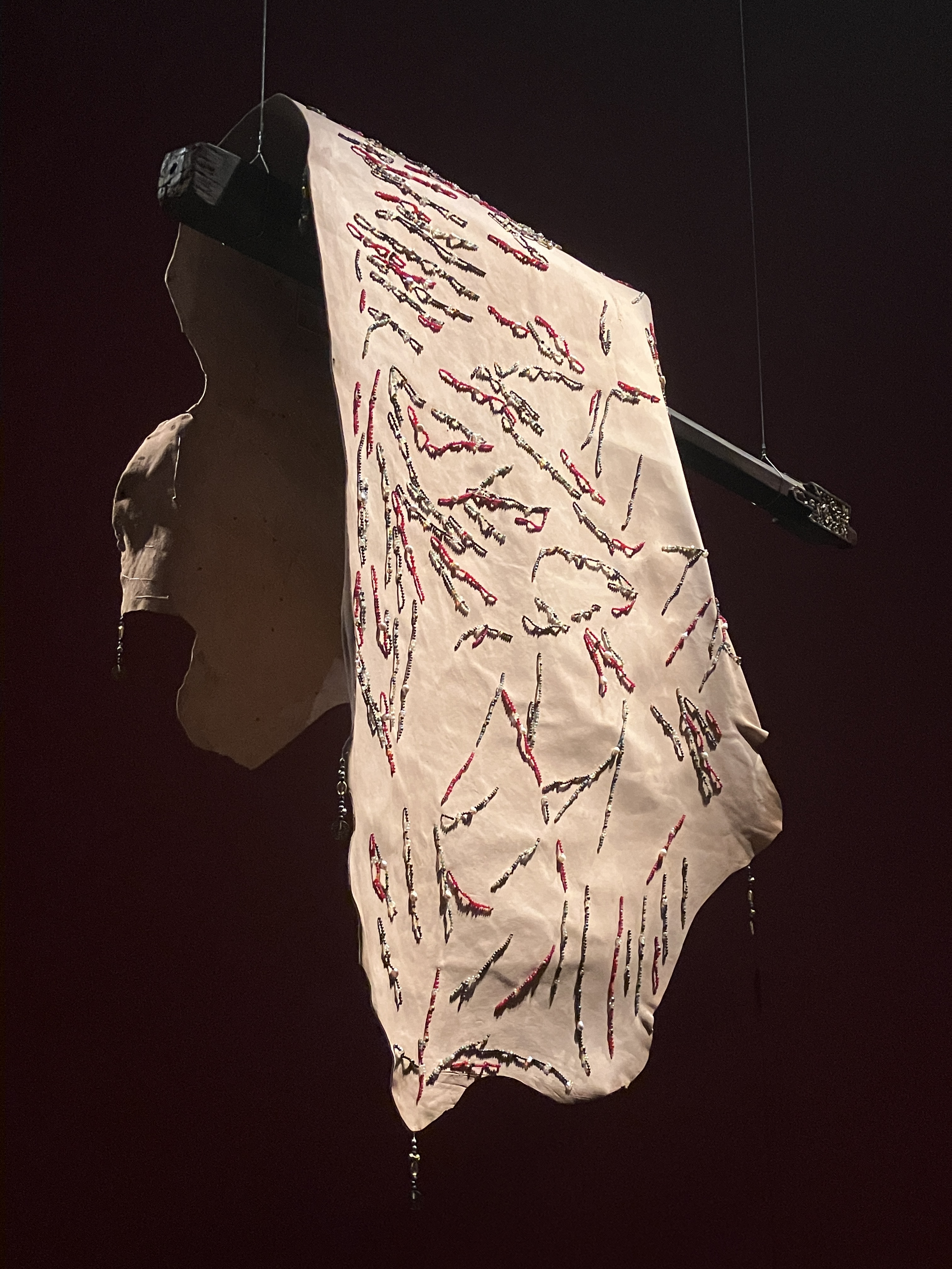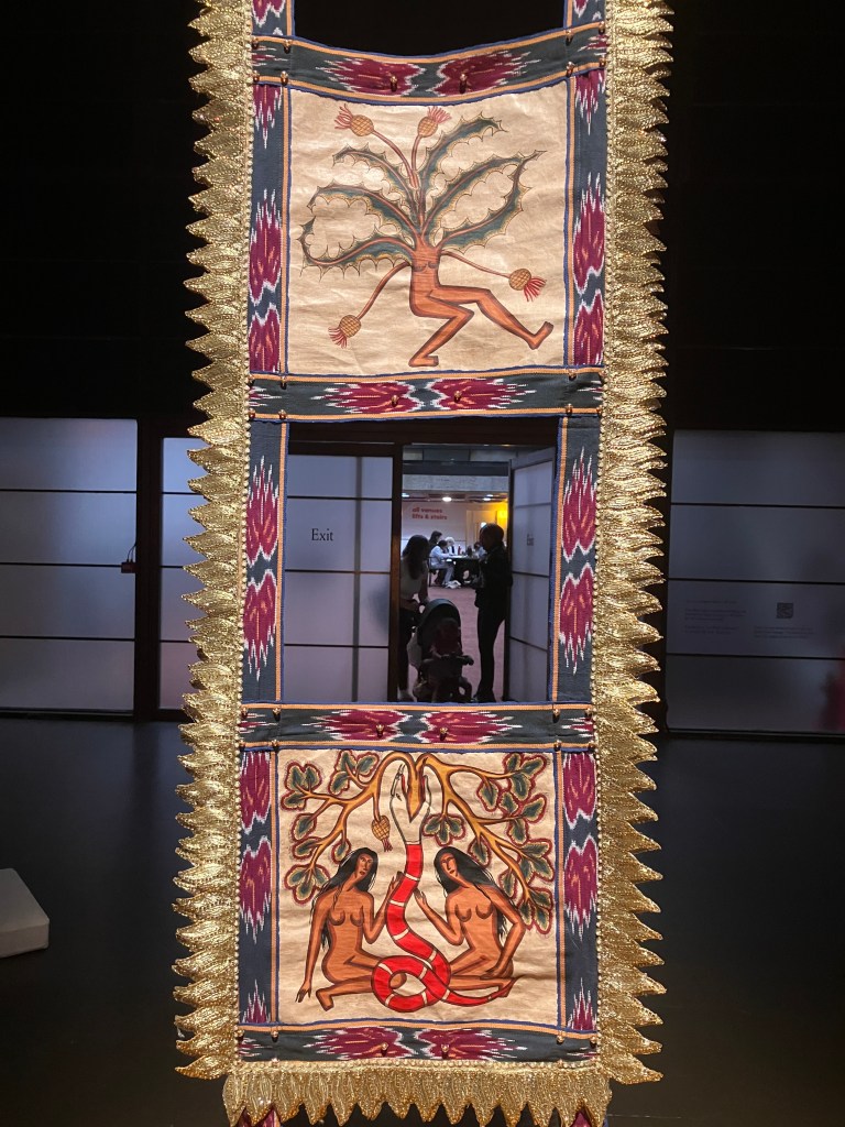 The Curve also offers the opportunity to move through Sasmita’s work and appreciate each craft and type of material she’s working with.. At the start of the exhibition, we see beads embroidered onto hides, which I’m assuming is some tradition, although, to be honest, I don’t know enough about Bali to say.. But I notice the hides hang on magnificent carved antique wooden pillars. This is a piece called Prologue,, and it is indeed the prologue to the show..