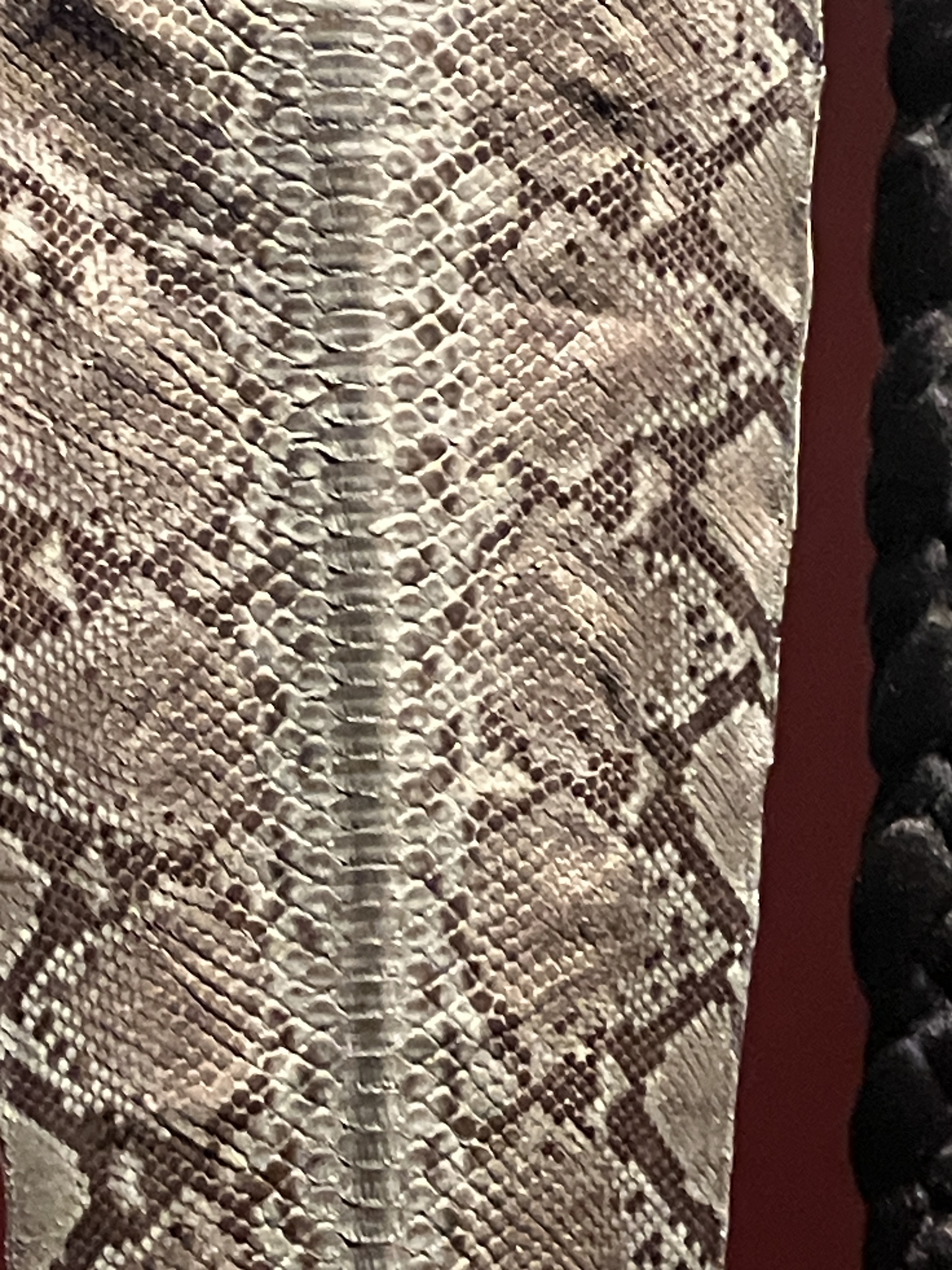 Passing the Kamasan paintings, we encounter two huge vertical installations where striking vertical paintings in the same style as the Kamasans are applied directly to the skin of a python.. I was quite astonished to see the python skin and wasn’t sure if it was real, but the gallery assistant confirmed to me that it was. I am strongly averse to using animal parts in art, and while I was really impressed with the work, it still couldn’t help but disgust me. This appears to be the skin of the reticulated python, given its huge size; it is the largest snake native to Asia. These pythons are commercially exploited for their skins, meat, and medicine and are harvested by rural people in the country. There’s evidence that Indonesian pythons have been commercially used for over 100 years without significant population declines. The inclusion of the serpent skin makes sense in the context of the reiterated symbol of the snake throughout the exhibition (see below on the significance of the serpent in Balinese folk culture). Still, I wish she had not used the Python’s skin in her art.