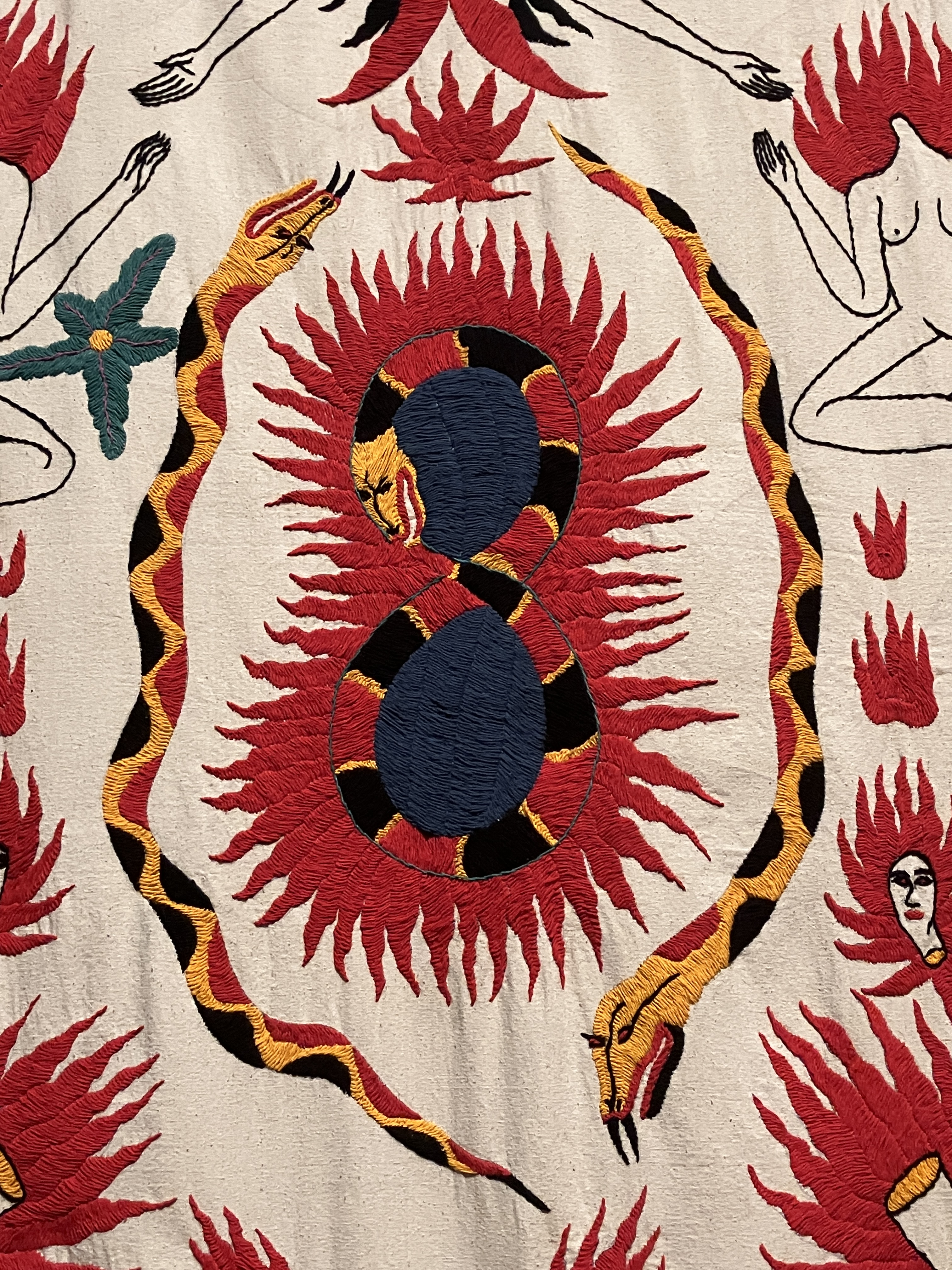 Into Eternal Land, the first solo exhibition of Balinese artist Citra Sasmita in the UK, combines elements of folk art (collaborating with women folk artists) and fine art installation with a reconfiguration of traditional mythology, aiming to take the audience on a symbolic journey through ancestral memory, ritual, and iconography. The Indonesian archipelago has a long history of displacement and migration, and Sasmita draws inspiration from a broad and diverse range of sources, including local mythologies from Bali and Indonesia, the great Hindu epic Mahabharata, and Dante’s Inferno. Citra Sasmita, a self-taught artist, has been receiving deserved attention of the past few years and it’s wonderful the Barbican has made it possible for us to view a comprehensive show of her work.