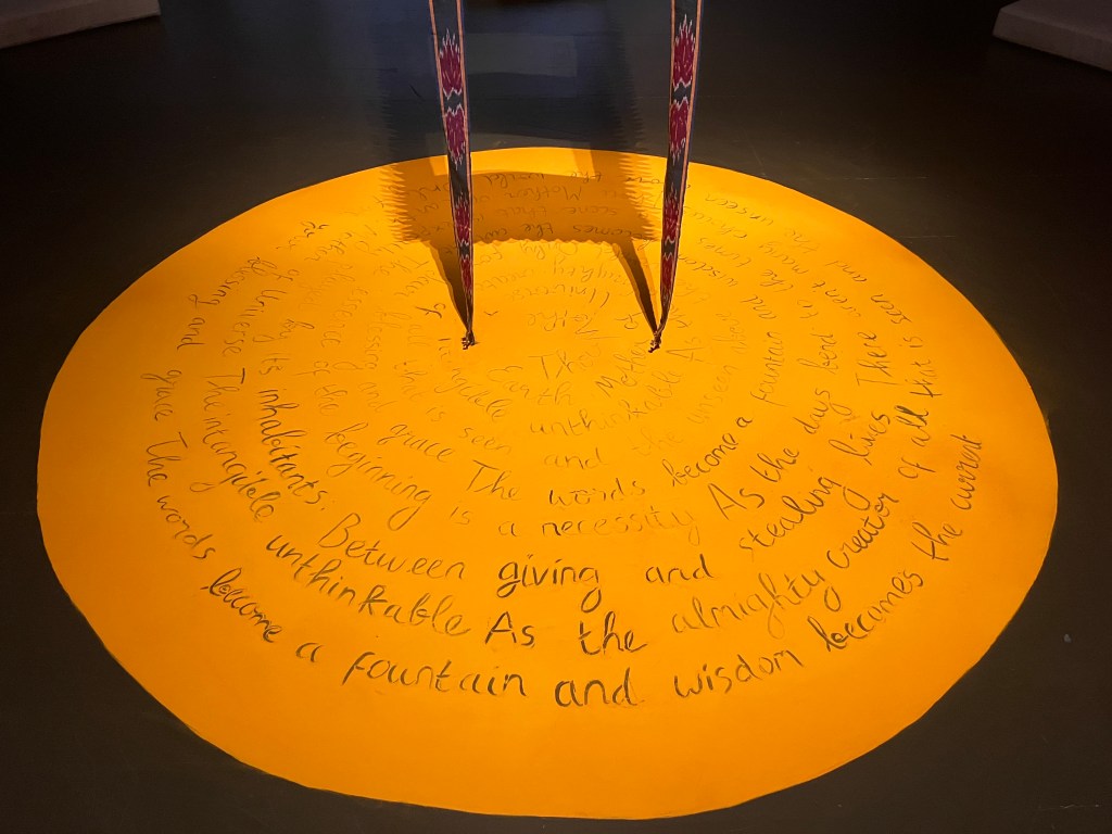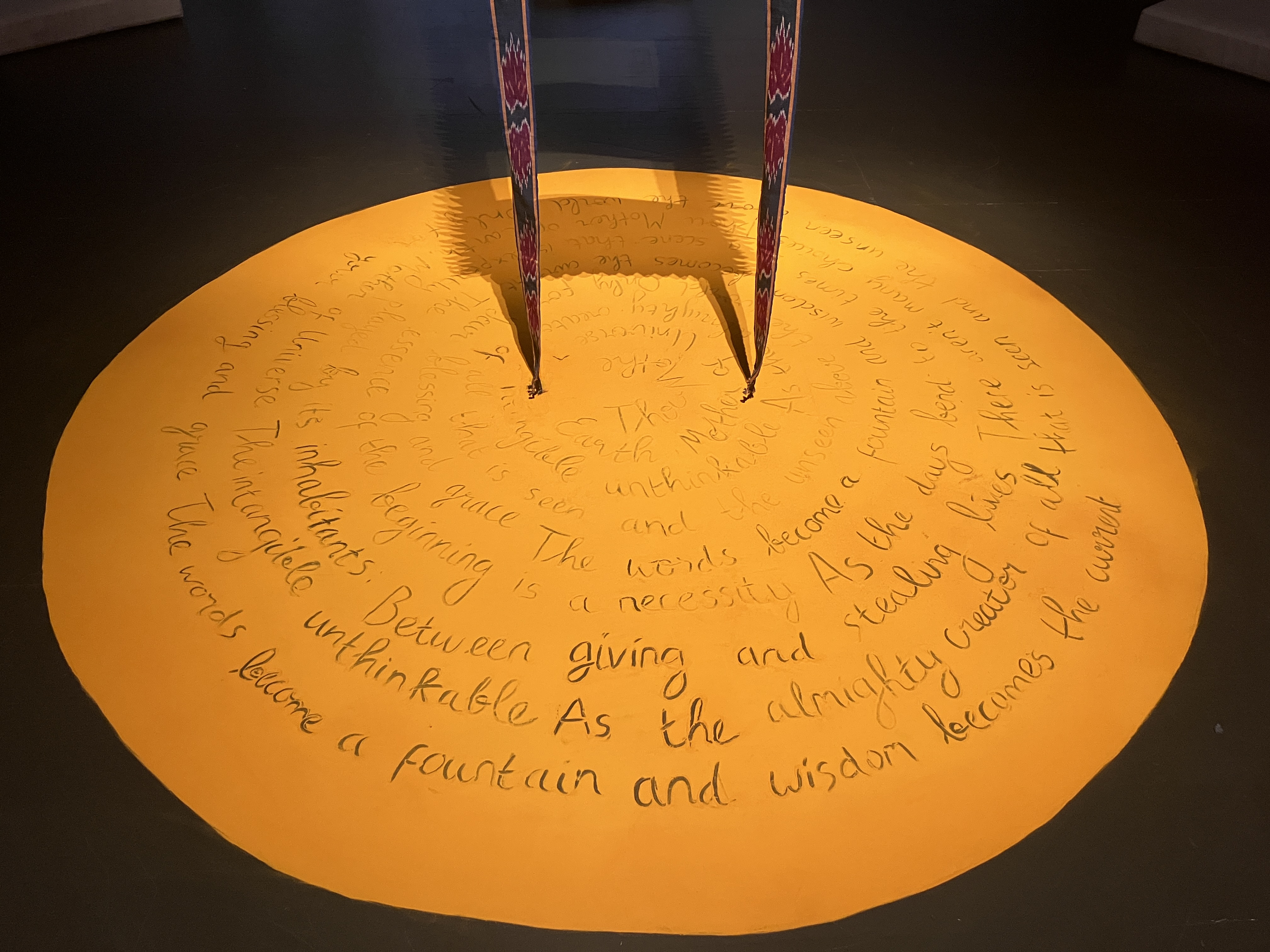 In the next work we move away from painting into stitchwork; Jero Mangku Istri Runi created the embroidery. These panels are particularly striking to my mind, more appealing than the Kamasan paintings, simply because of the sheer pleasure in looking at the stitchwork At the end of the exhibition, there is a large multipart embroidery piece like a ladder reaching up to the top of the ceiling but grounded in a striking mound of real turmeric spice, in which the artist has written a prayer.