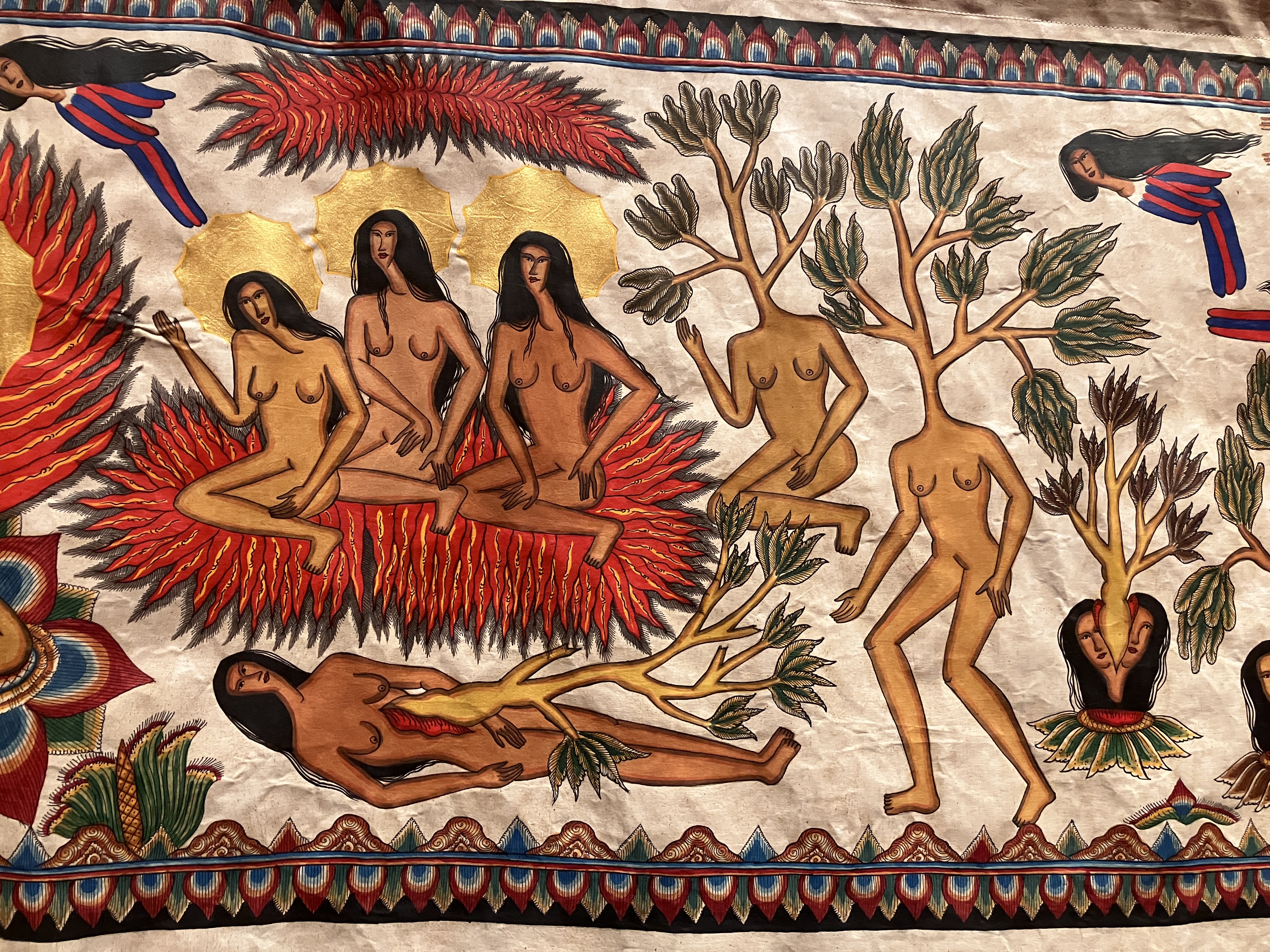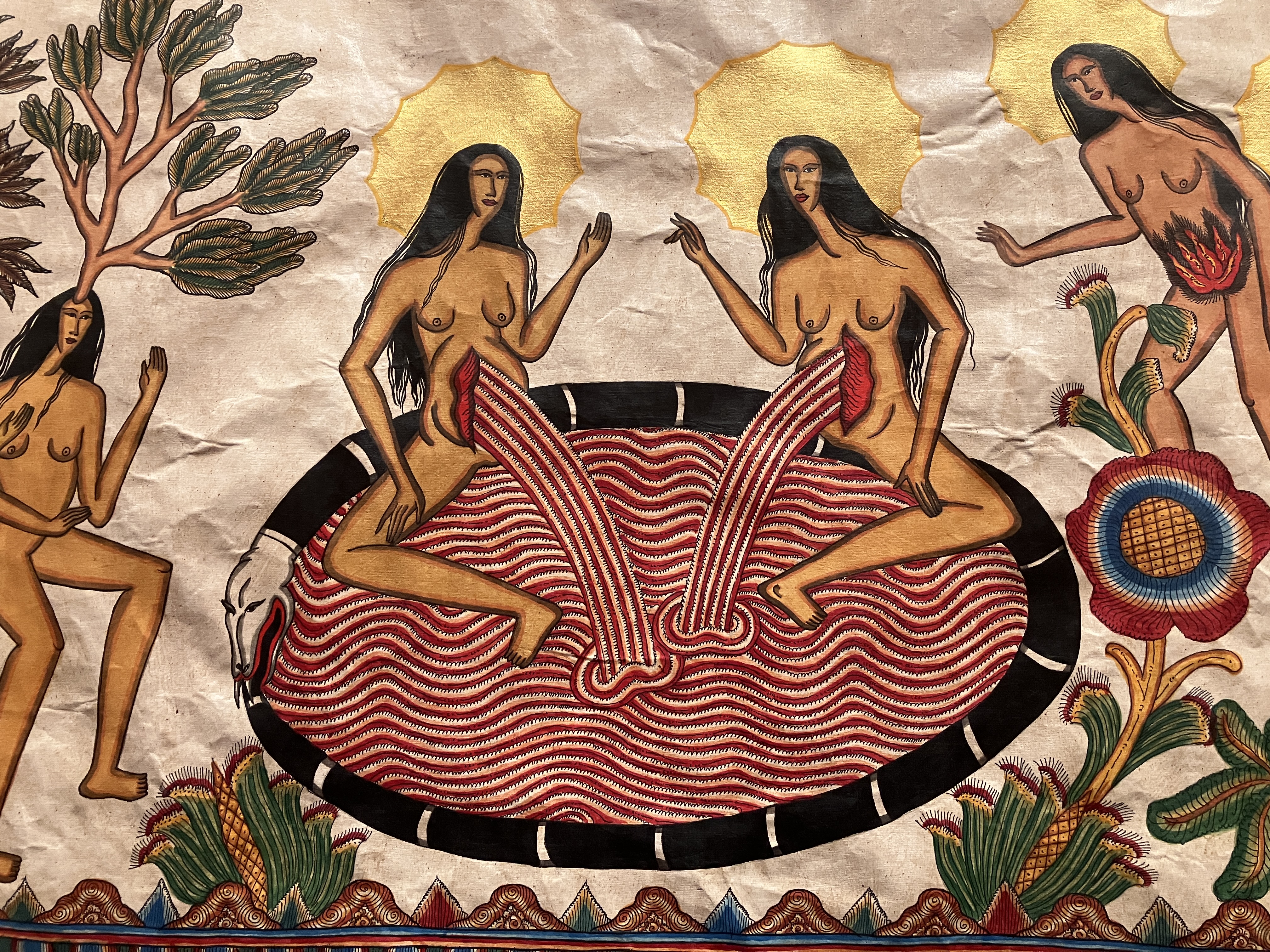Sasmita’s collaboration with traditional folk artists is truly confident and expertly executed. Looking at the work in this exhibition and the online pictures of the traditional work, it’s evident how Sasmita has adapted the symbolism and images. It would have been fascinating to witness this collaboration in action. I would have loved to see documentation of the artists working together; it would have been a real asset to the exhibition. The clear skill and understanding of the tradition coming from the folk artists blends seamlessly with the artist’s vision, and I believe this combination works exceptionally well. In this show, filled with wild women, frenetic rituals, and the merging of nature forms such as trees and snakes with humans, Sasmita demonstrates her interest in exploring the problematic histories of Balinese culture and colonial interpretations.