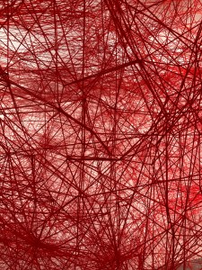 I visited the work when I arrived at the Museum and then again before I left. It was two wholly different experiences. My first walkthrough was filled with wonder and amazement at Chiota’s idea and skills. I felt joyful and buoyed up by being inside the threads, enjoying the strange perspectives. Hours later, after viewing the Museum, having lunch, and enjoying the café terrace for a while, I visited again. This time, I felt wistful. I became more aware of the abandoned suitcases. The threads felt more oppressive. I recalled that for some, leaving is an escape, but we are always drawn back to our roots, the threads binding us, however thin they may be.