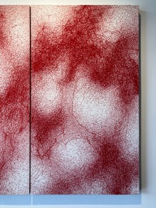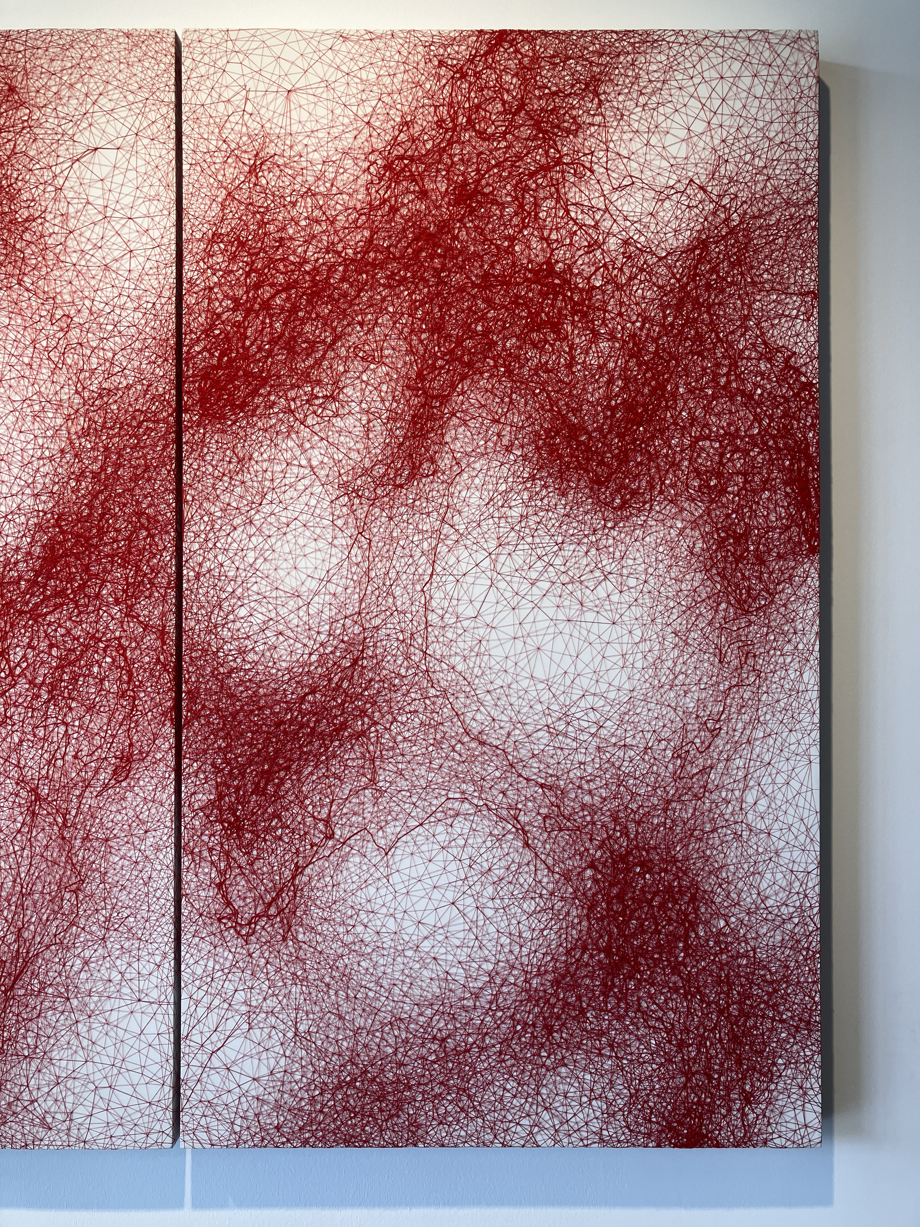 The piece is beautifully installed and curated in a space that feels private and invites contemplation and dreaming. Being inside the labyrinth of threads feels both comforting and contained – and also like being trapped in a spider web. The feeling of veering between comfort and discomfort is, I think, key to good art.