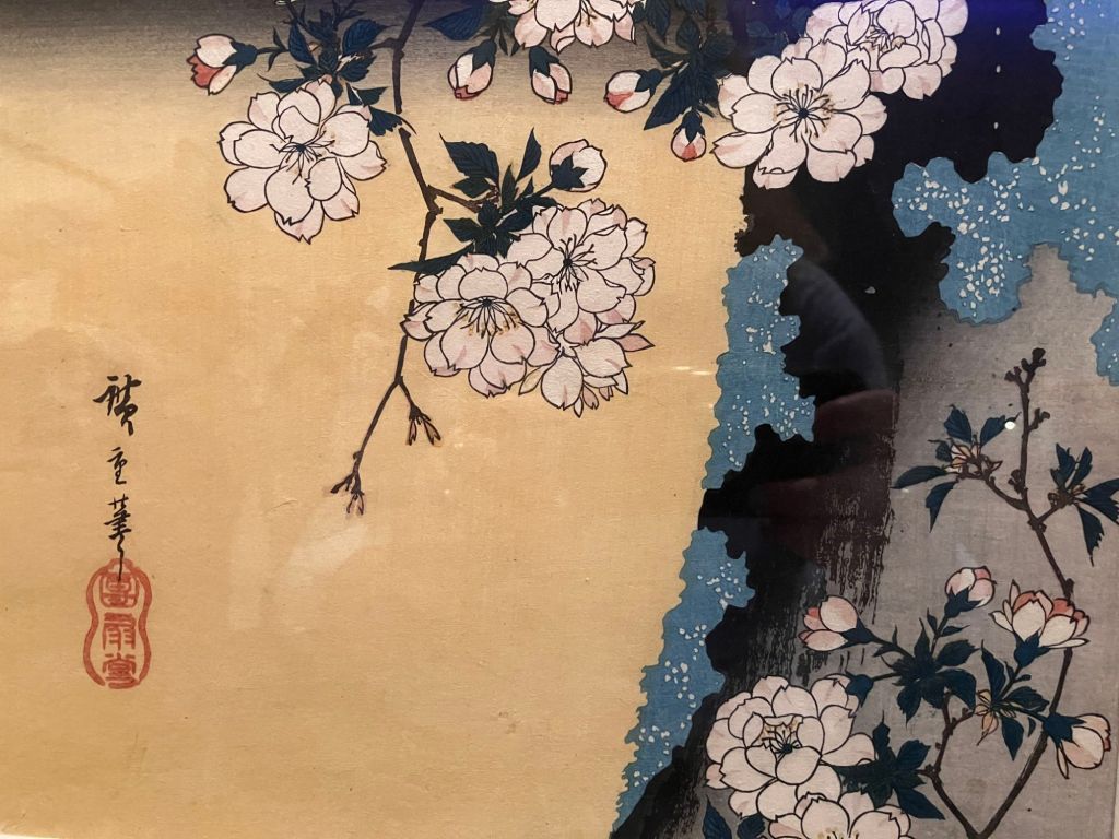 In this exhibition, we see how Hiroshige made several arduous and fascinating journeys between Japan’s 2 capitals, Edo (now Tokyo) and Kyoto. In his print series he depicts both: the coastal route and the arduous mountain route. His drawings were carved into wood blocks and printed as colour separations. The exhibition did an excellent job explaining exactly how these woodblock prints were made,. They were complex and difficult. Not only did the drawing have to be precise, but it also needed to be replicable onto numerous different blocks of wood so that all could be lined up and accurately have colour applied. (People who do screen painting know how the process works).