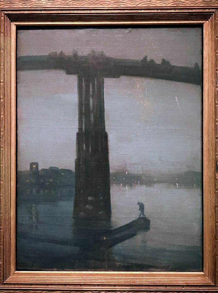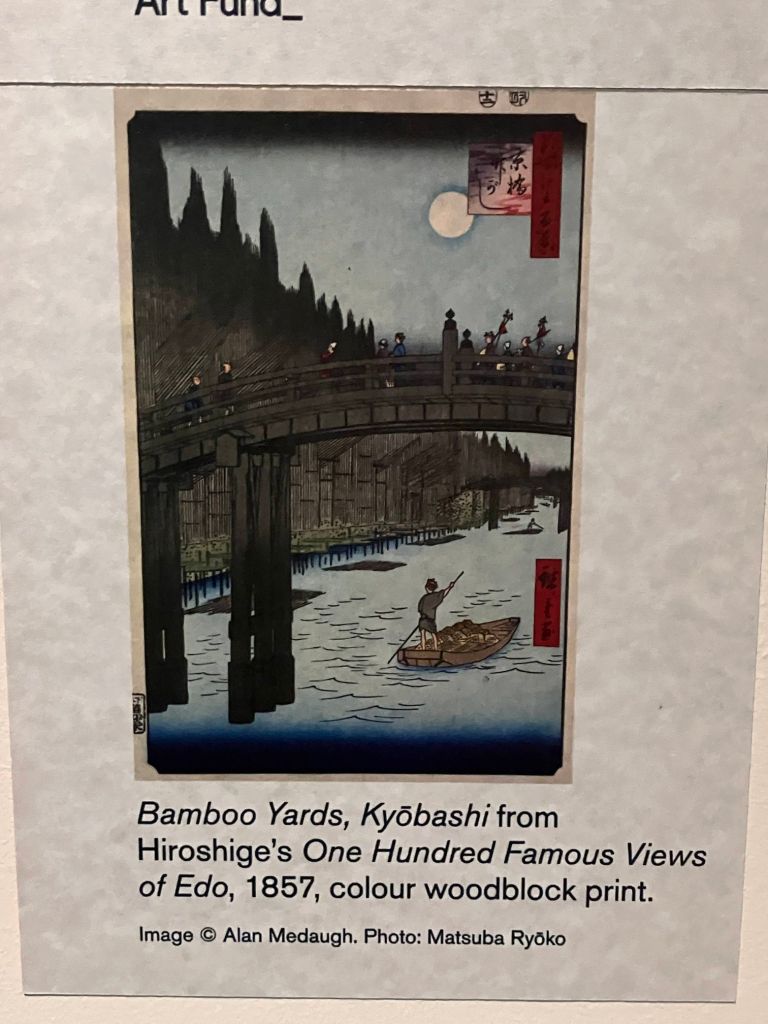 1I am certainly fortunate that I managed to see this show just before it closed. I wasn’t the only one. It was very busy and people were really spending a lot of time in front of each picture, giving it the attention it deserved. It is the first exhibition of the artist The British Museum has done in many years. It’s wonderful to see that there appears to be a new appreciation of ukiyo-e, that beautiful and highly influential art form. The exhibition closes with a small selection of artworks influenced by Hiroshige, including one of my favourite paintings of the late nineteenth century: James McNeill Whistler’s Nocturne: Blue and Gold – Old Battersea Bridge (1872).