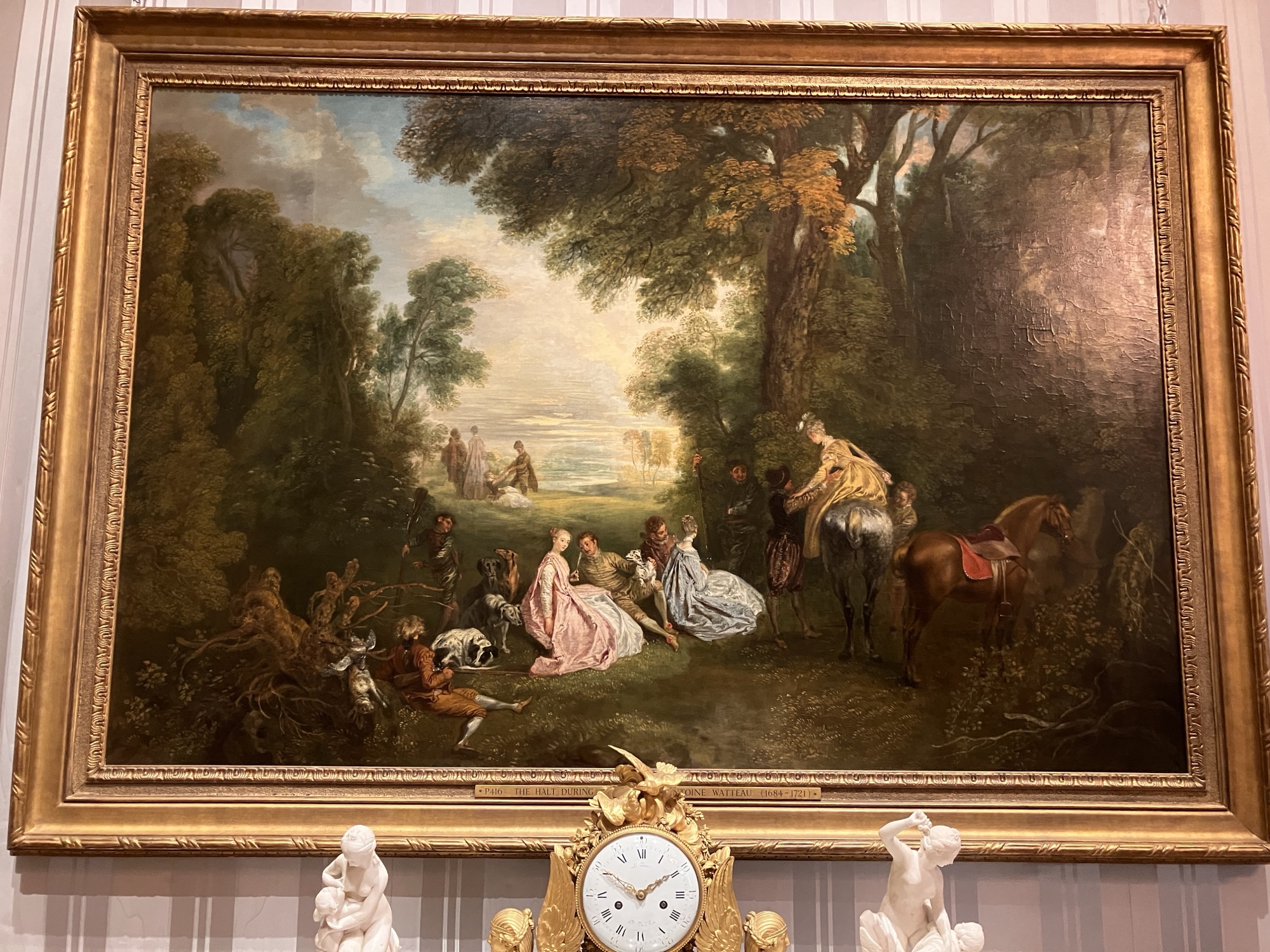 Rendez-vous at the hunt (painted 1717-18 so late in Watteau’s life) is typical of Jean-Antoine Watteau’s ‘fêtes champêtres’ (outdoor party, is the best translation I can come up with) paintings which express both joyous good times and a touch of melancholy. These leafy idylls are staged as fleeting interludes, poised at the moment when pleasure is already shading into loss. The music, flirtation, and silvery daylight that bathe these gatherings signal ephemerality—light fades, and parties disperse—so the pastoral setting becomes a theatre of passing time rather than a realm of timeless ease. Figures rarely lock into secure embraces; they hesitate, glance away, or drift toward the edges of the grove, their errant gestures and uneven groupings suggesting desire that is unfulfilled or already dissolving. Motifs intensify this elegy: we see a hint of autumnal foliage and late-afternoon light – tuning the eye to transience. Far away, bathed in light, the world is immaterial, watery. In this suspended, theatrical world, delight is inseparable from disenchantment, so the fête becomes a reverie haunted by time—beautiful precisely because it cannot last.