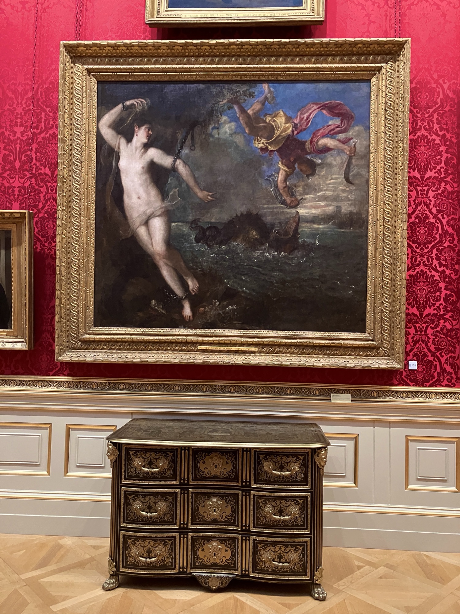 According to Greek Myth, Andromeda was actually an Ethiopian princess, so really Titian’s lady is the wrong colour, but he was simply following the Eurocentric tradition. The story is rather horrid: Andromeda is the daughter of Cepheus, King of Ethiopia, and Queen Cassiopeia. When Cassiopeia claims to be more beautiful than the Nereids, Poseidon unleashes the sea monster Cetus to wreck Ethiopia’s coast as divine punishment. The ultimate toxic mother, Queen Cassiopeia believes that chaining Andromeda to a rock as a human sacrifice will satisfy Poseidon. Perseus discovers her when he returns from his quest to decapitate Medusa. Perseus attacks the Cetus the Monster, and petrifies him with Medusa’s head. Having saved Andromeda, Perseus carries her back to Greece to marry her and rule as his queen.