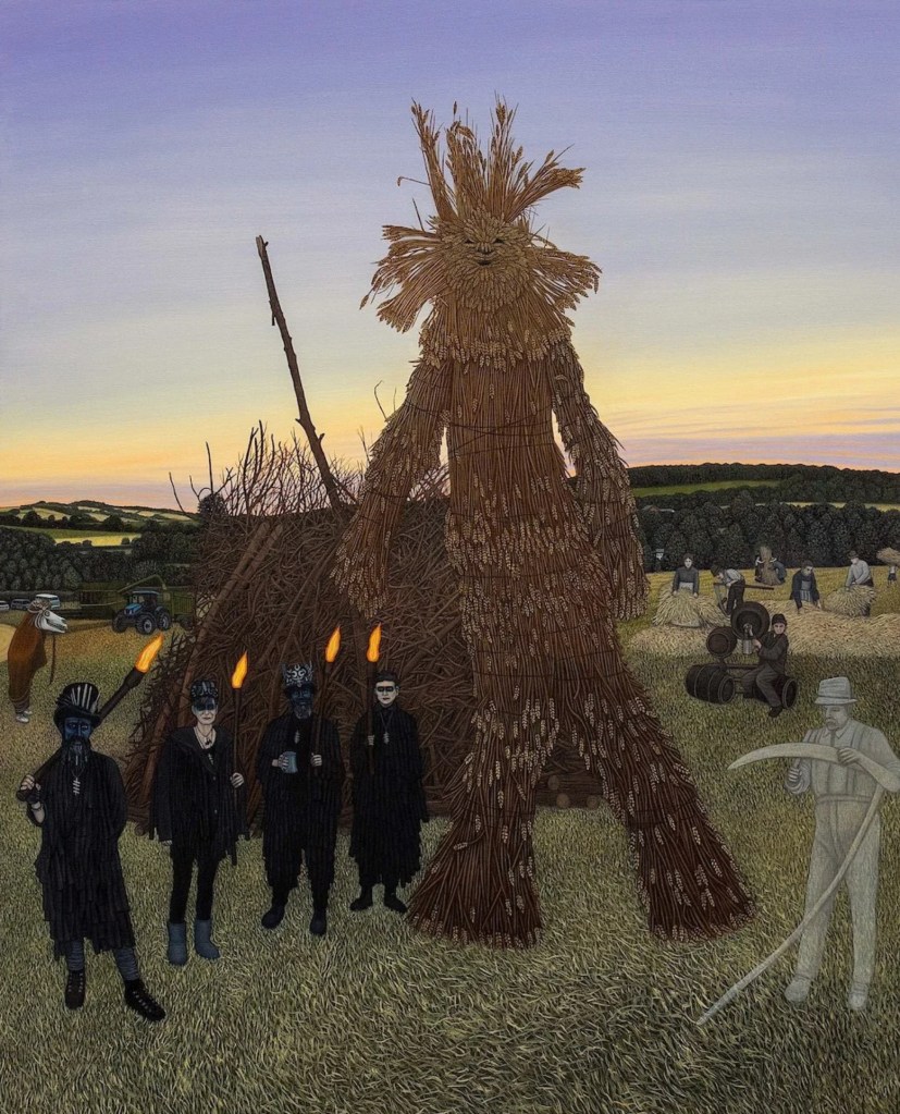 I won’t say there aren’t criticisms of the artist’s work, though these don’t really come from me. But I have heard it said that Edge is just illustrating folk culture or folk magic, but I don’t really think that’s strictly true. I guess Edge quite rightly positions himself as the recorder, observer, and occasional participant, but he’s not claiming magical knowledge. He’s not claiming any role of shaman or expert. Instead, he is learning about it by painting it; he’s discovering Albion’s deep roots and the rituals and practices by visiting them and painting them. Here, painting is a way of Understanding, and I think this is translated to us as the viewers. I also believe that there’s something delightfully cinematic about Edge’s paintings they are in a sense rather literal at least on the surface and could be imagined as scenes from films. This is coming from me quite a compliment because I think that the cinematic in painting and the painterly in the cinema are about the highest level that either can achieve. Yes of course there is a residual flavour of THE WICKER MAN in these paintings but of course that film is as much part of our collective folk heritage as anything else.