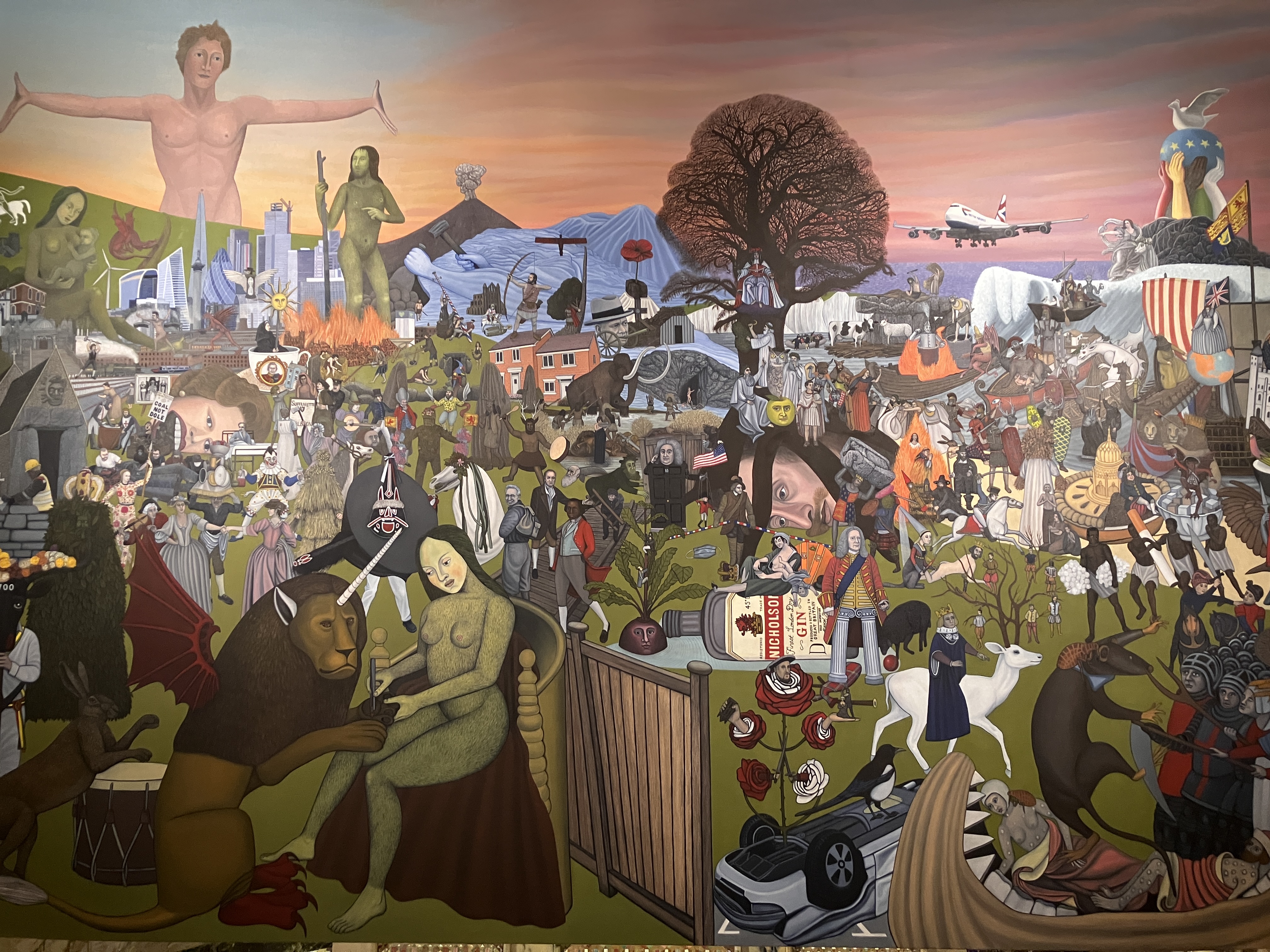 The centrepiece of the exhibition is the large painting Children of Albion, painted in 2025, which is positioned in the altar place of the chapel. This, in the grand tradition of history painting, offers us a history of Britain from ancient times to the present. It is a playful yet profound piece of artwork with sly comments, pointed art-historical references, contemporary jokes, and, above all, an aching love for these islands.