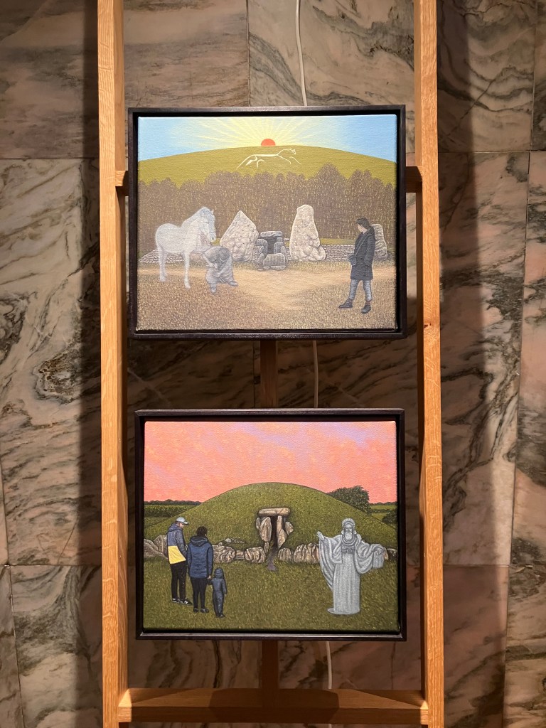 One of my particular favourites is the chapter on the Vale of the White Horse, which is an oil painting that also incorporates chalk from the Uffington White Horse, painted in 2022. The Uffington White Horse is an incredible sight, a white horse carved into the chalky earth of a large hill in Uffington, Oxfordshire. I visited it myself also in 2022; it is an incredibly beautiful place. In the book, Edge describes his visit to the Uffington White horse to witness the chalking (also known as Scouring) ceremony which he says has been taking place from as early as 1380 BCE which was when this mysterious stylised image of the horse was first carved into the hillside.
