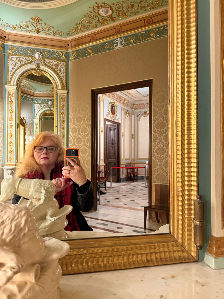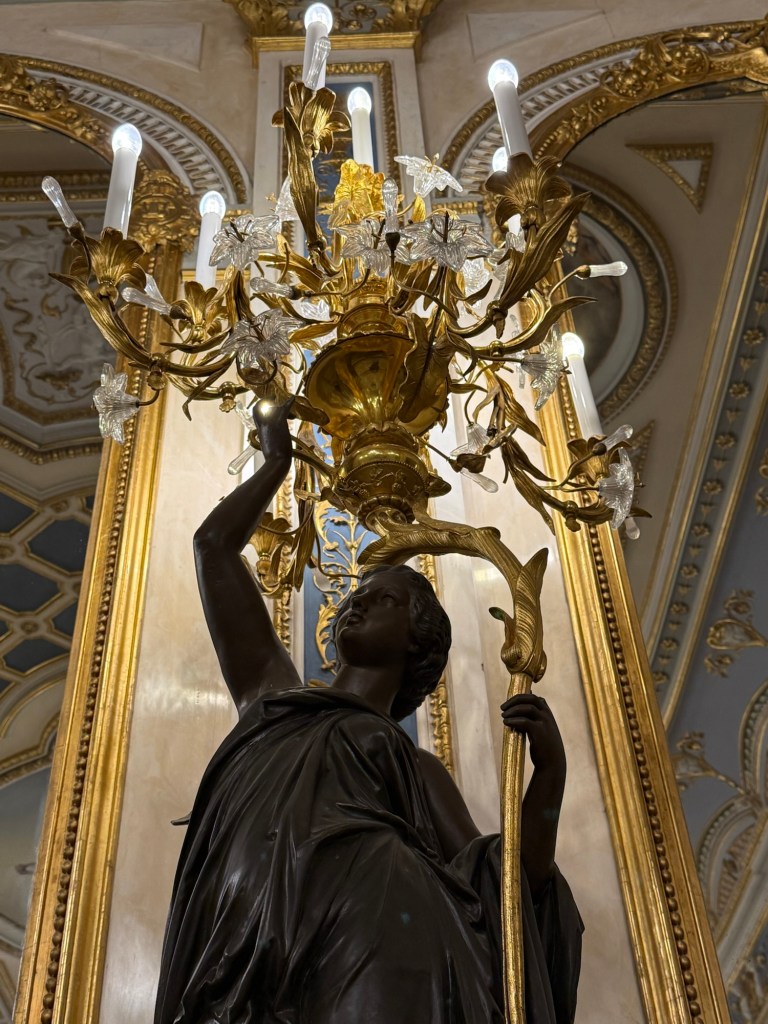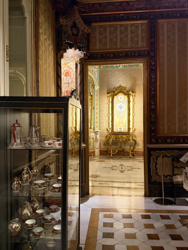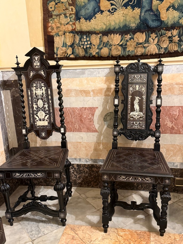 One thing I found very interesting is there are rooms decorated in the Rococó style (see above ) but they date actually from the 19th century – so they resemble almost a stage set. They are deliberate reconstructions of the decor and furniture from a century earlier. I wasn’t aware that there were many people doing that, and I don’t know if it was particular to this family or was a Spanish fashion or maybe was more widespread. In any case the attention to craftsmanship and taste is very interesting because it’s not exactly Rococó but there’s many of the qualities of Rococo. Those people who know more about applied art and design than I do will have a better idea of it but it certainly strikes me as fascinating and also beautiful.