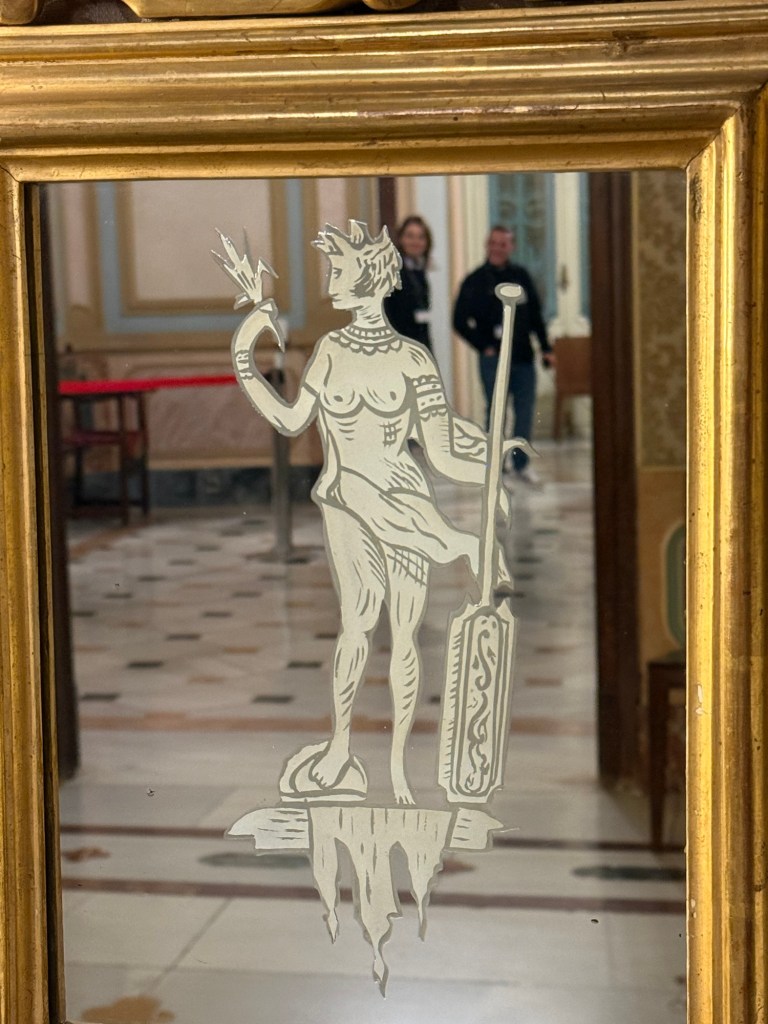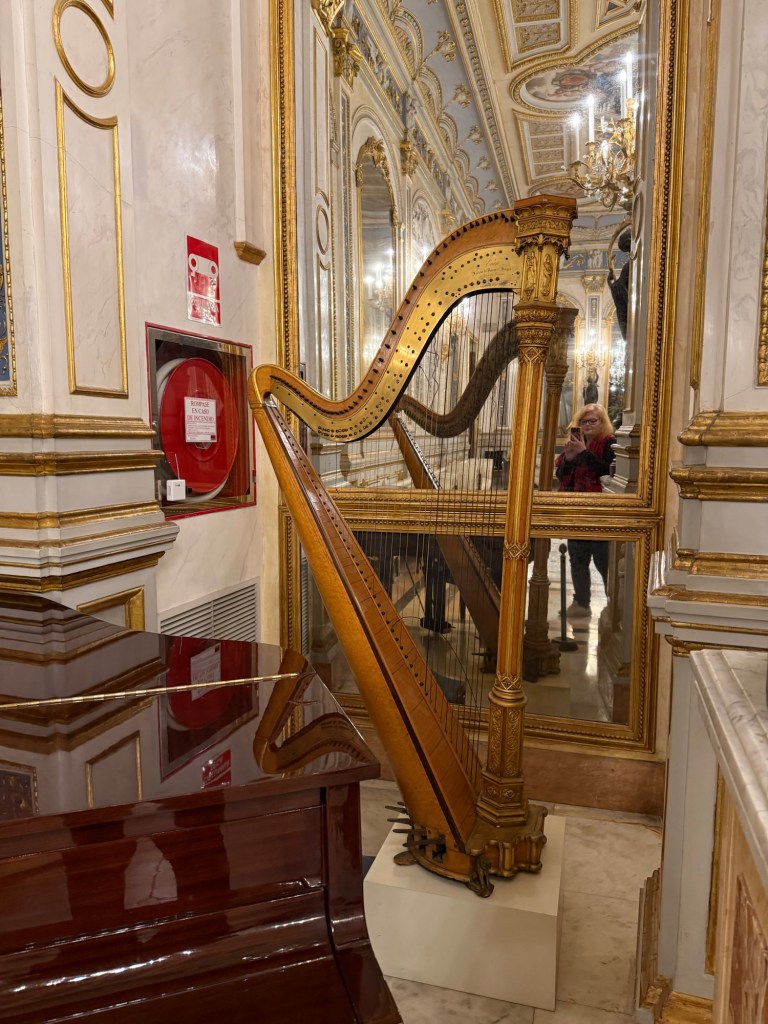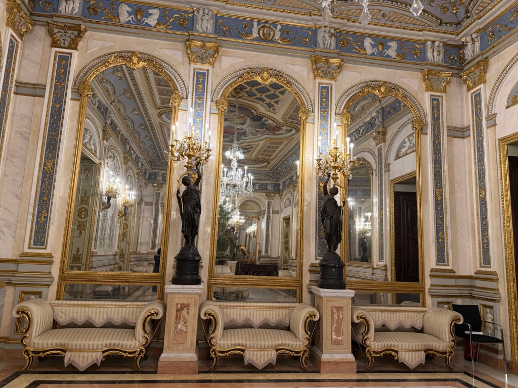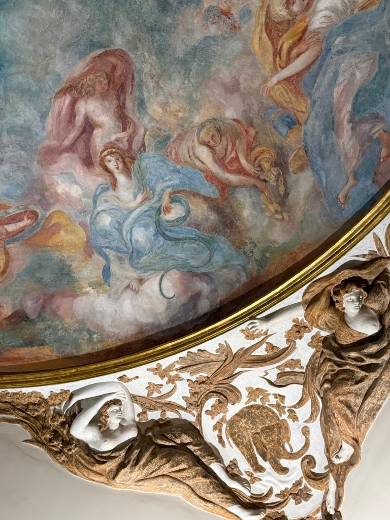 One thing I found very interesting is there are rooms decorated in the Rococó style (see above ) but they date actually from the 19th century – so they resemble almost a stage set. They are deliberate reconstructions of the decor and furniture from a century earlier. I wasn’t aware that there were many people doing that, and I don’t know if it was particular to this family or was a Spanish fashion or maybe was more widespread. In any case the attention to craftsmanship and taste is very interesting because it’s not exactly Rococó but there’s many of the qualities of Rococo. Those people who know more about applied art and design than I do will have a better idea of it but it certainly strikes me as fascinating and also beautiful.