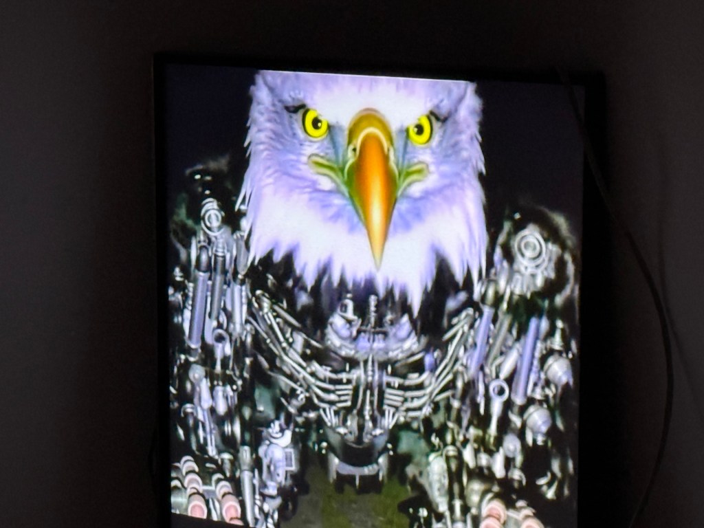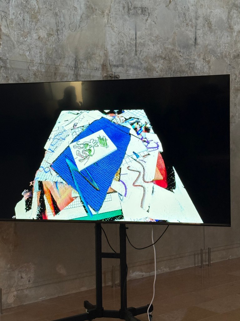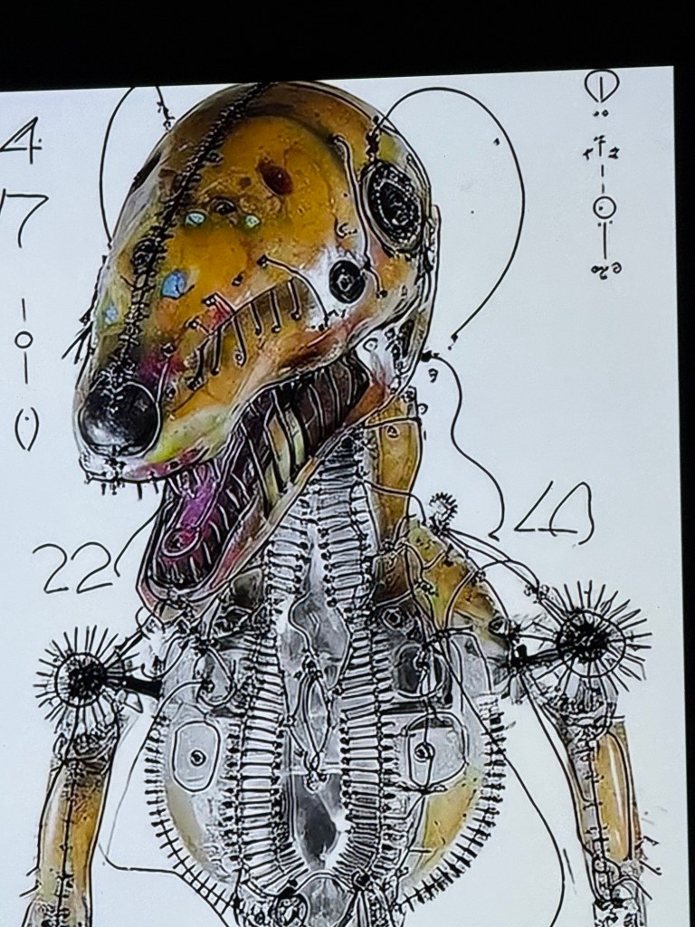 I was particularly entranced and spent a long time with this multiscreened piece called the chains of the kernel. Unfolding in time, each screen proffers a series of absolutely grotesque images that combine and recombine via algorithm processes into image sequences that are both highly disturbing and absolutely hilarious in the blackest humour. While not actually offensive, the images are extremely unsettling because we recognise them. We recognise them as part of the detritus of our culture; they’re like a monstrous ayahuasca encounter – but without the vomit. (I was immediately reminded of my last ayahuasca experience where I saw a lot of stuff exactly like this – it was extremely entertaining and cathartic.)